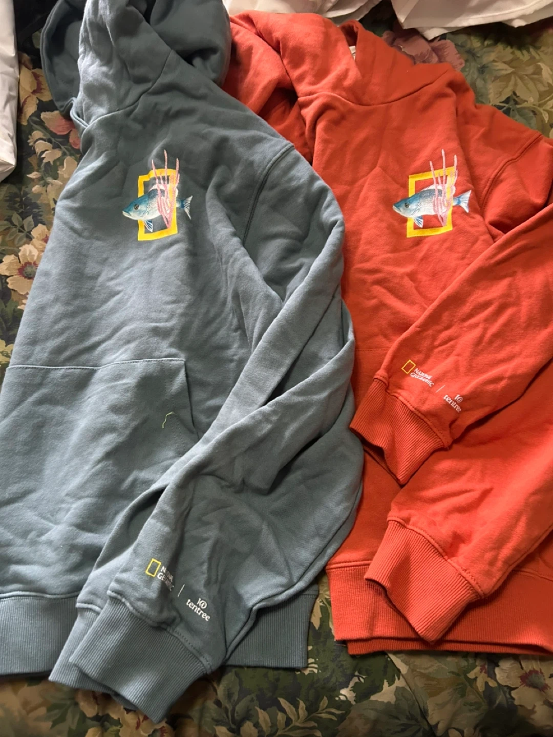 Cozy tentree and National Geographic collaboration hoodies in size medium and small The hoodie features a unique fish graphic and the National Geographic logo on the sleeve. Great for staying warm and showing off your love for nature. Available in medium bluish grey colour or small orange