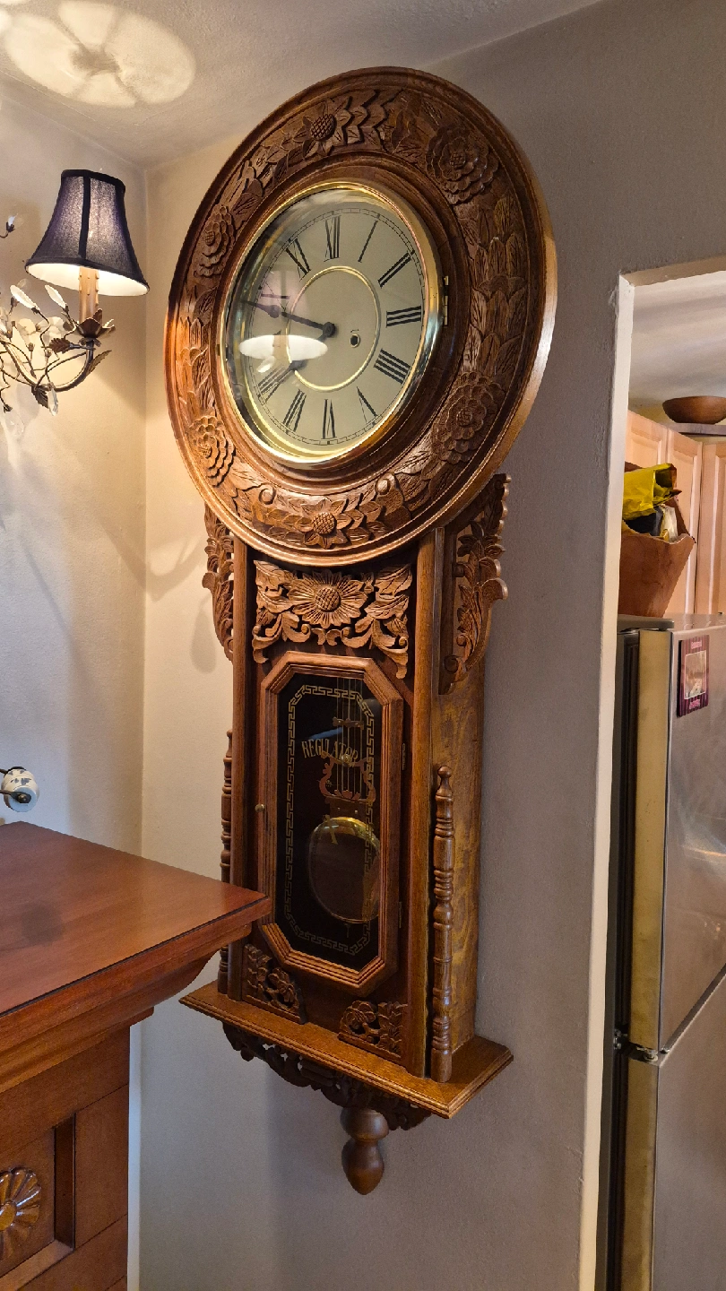 Beautiful ornate wooden wall clock. It has intricate carvings and a classic design. A lovely addition to any room! classic chime.