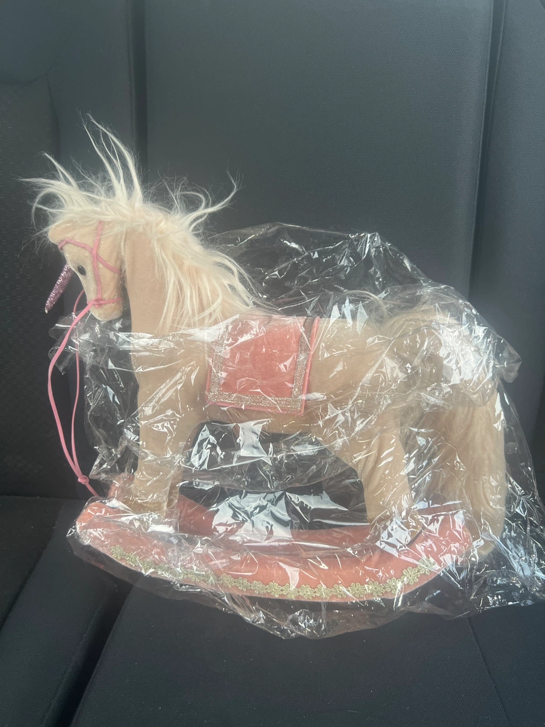 Rocking horse unicorn in excellent condition! The base is pink and the main body is a beige colour. It's still in the original packaging
