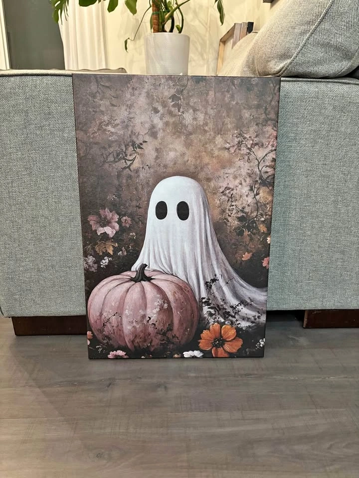 Beautiful ghost and pink pumpkin print on canvas. Framed (by me) onto 23.6”X15.7”X1.5” wooden frame. Light weight and ready to hang with sawtooth hanger attached. Pick up in BOWMANVILLE near Northglen Blvd.