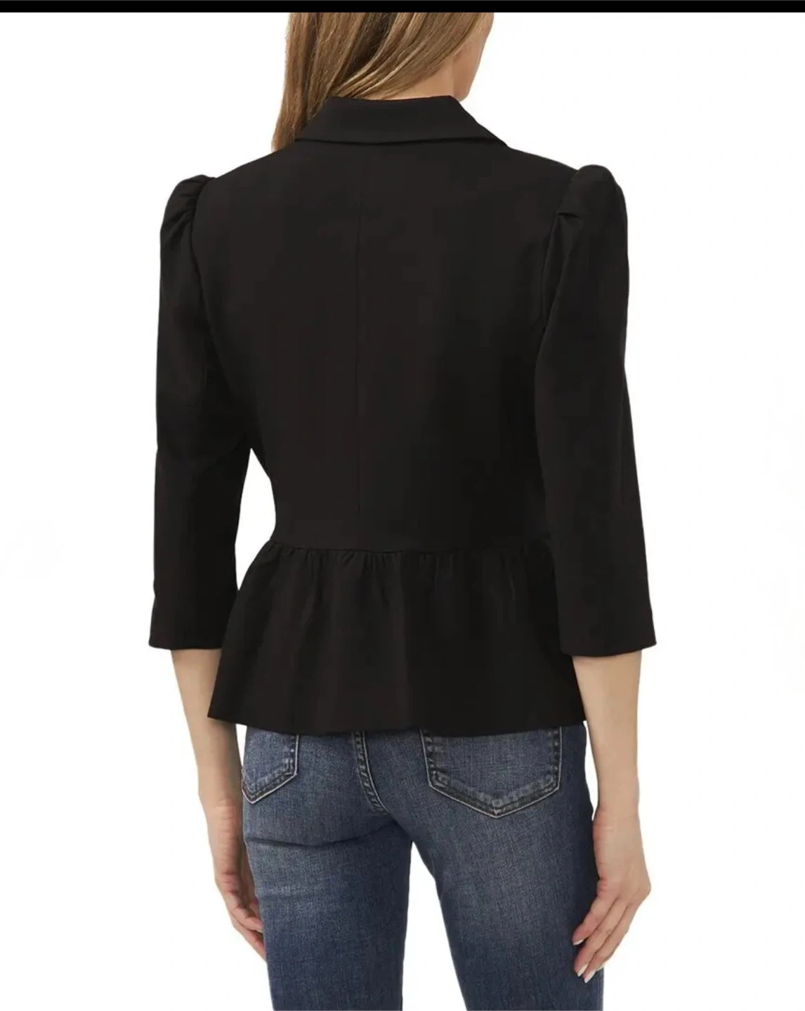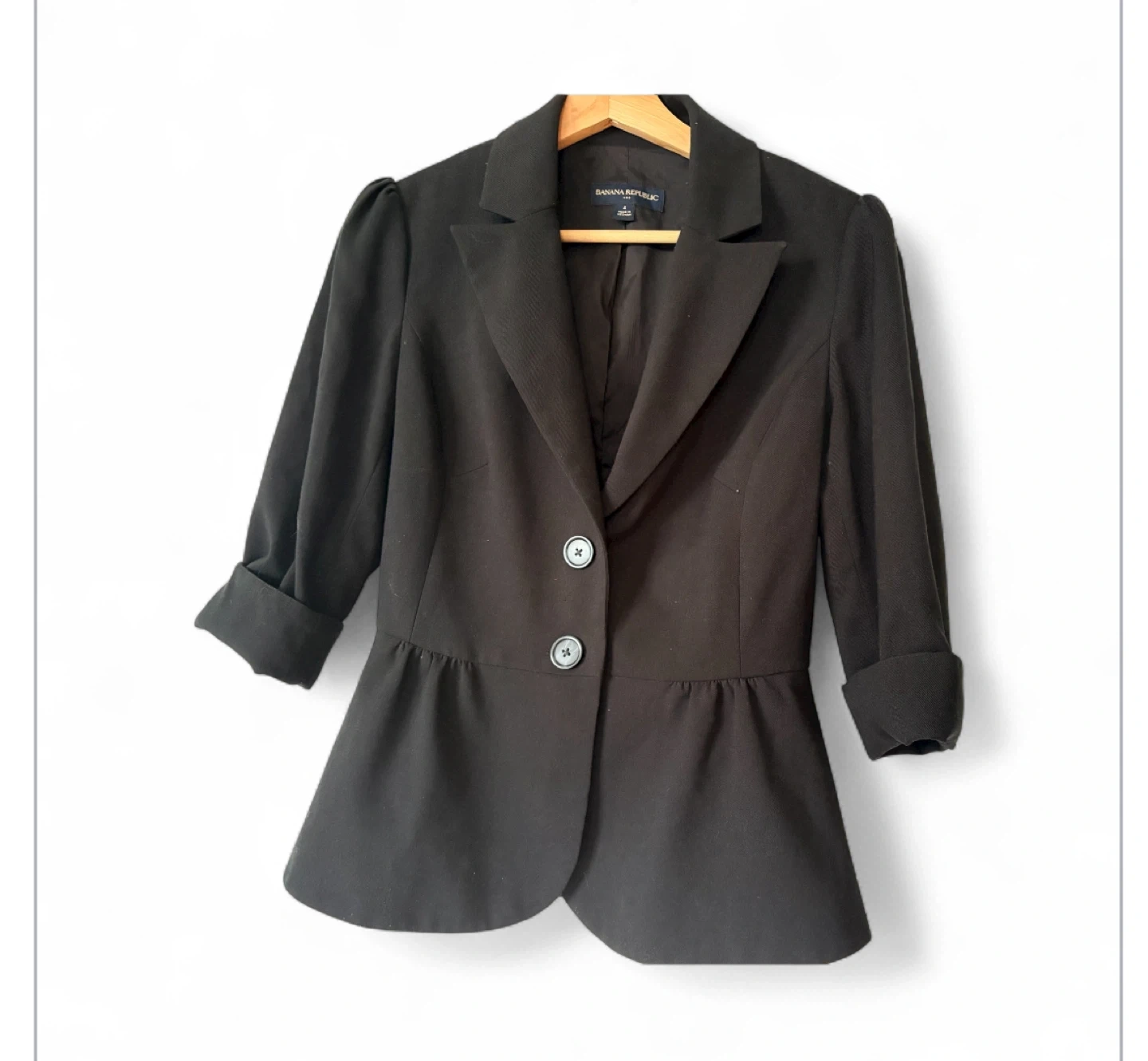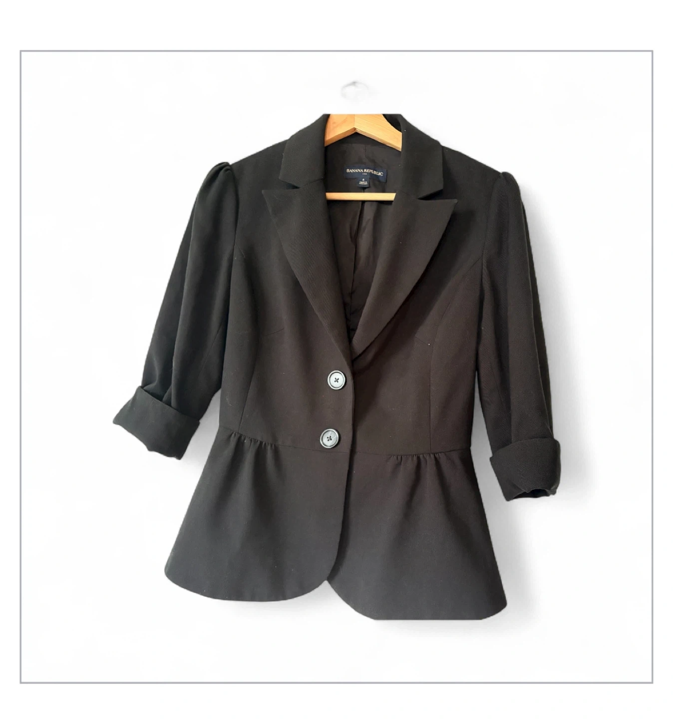 85Selling a Banana Republic black peplum blazer. It's in great condition and features a flattering peplum silhouette. Perfect for adding a touch of sophistication to any outfit! Feel free to also check my other listings make a bundle with discount.