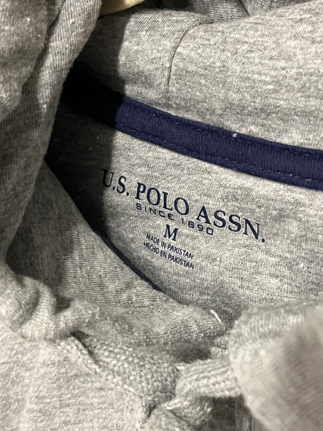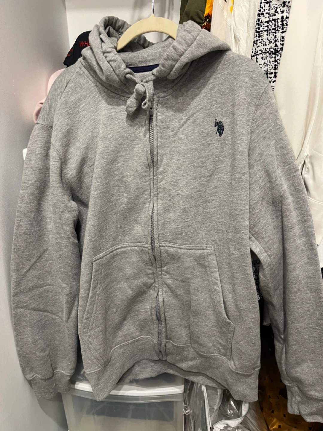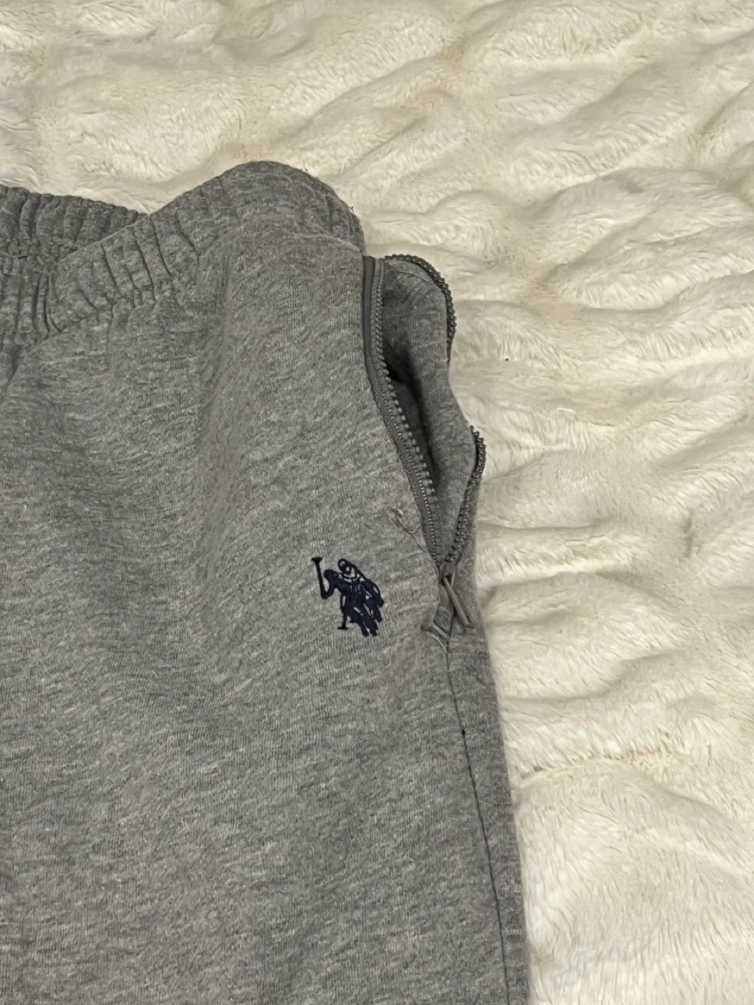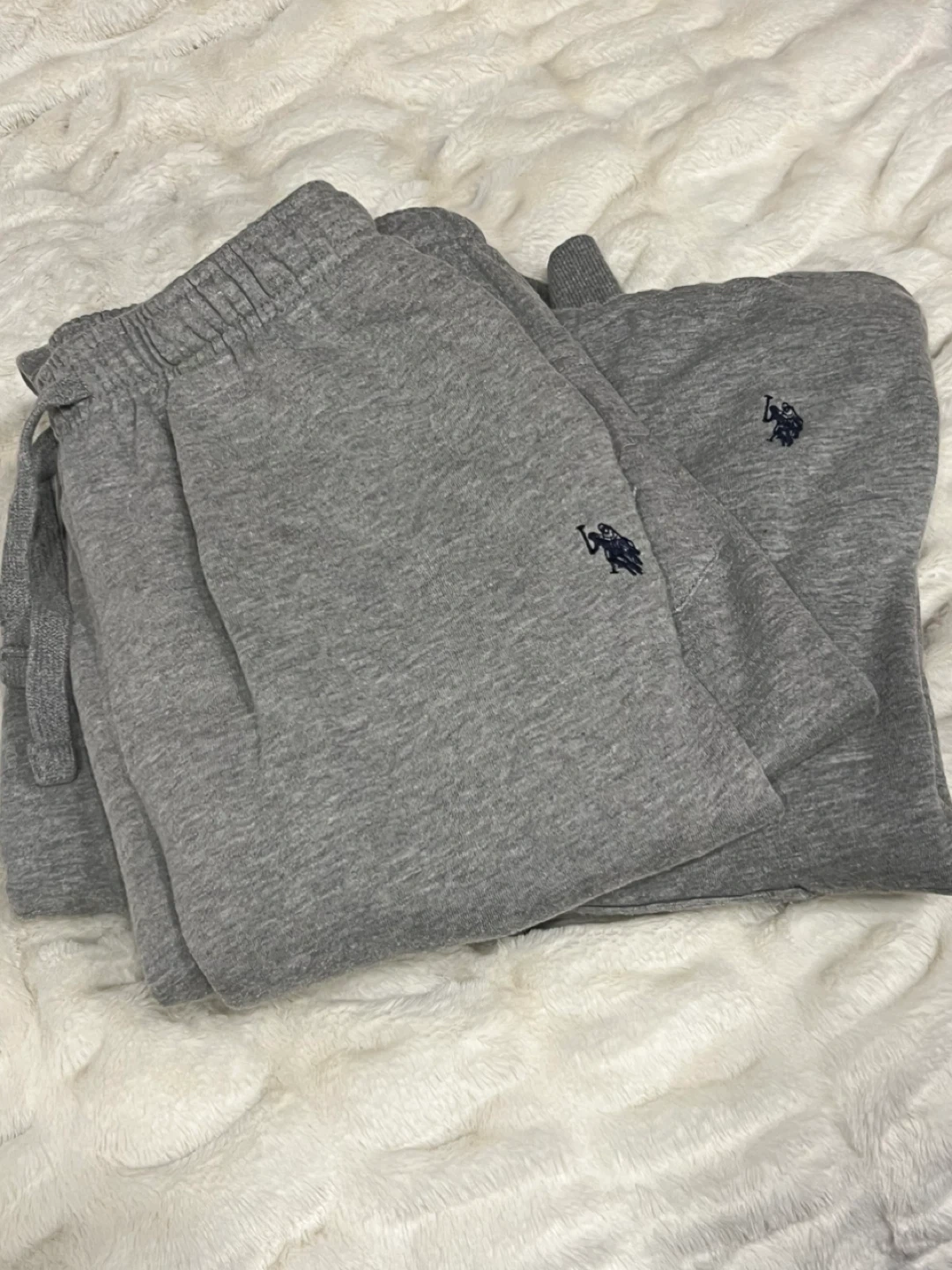 Selling a comfy U.S. Polo Assn. set! It includes a grey hoodie and matching sweatpants, both in size medium. The hoodie has a full zipper and the sweatpants have a drawstring waist. Perfect for lounging or running errands!