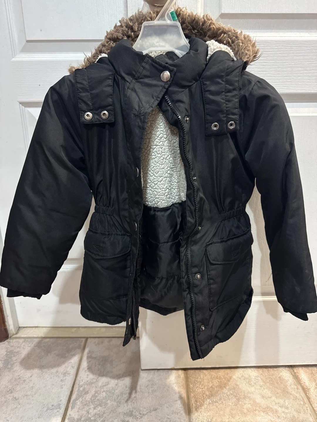 28Here's a cozy black winter jacket, perfect for keeping warm during the colder months! It features a fur-lined hood and a comfortable fit.