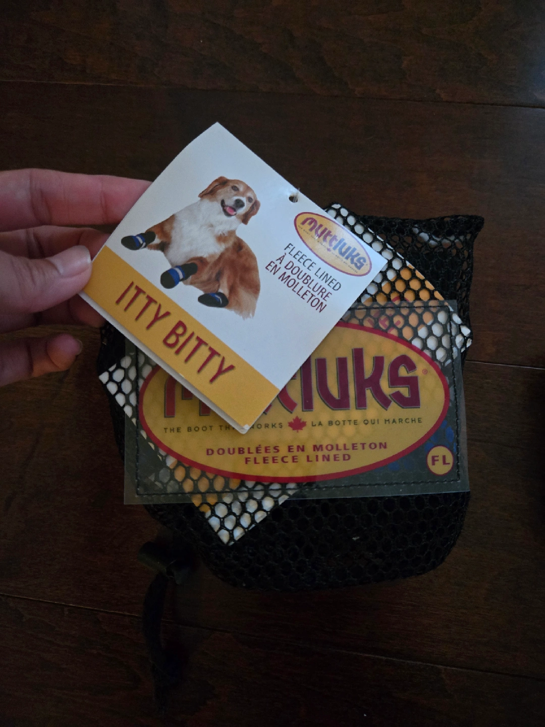 I'm selling a brand new set of Muttluks Itty Bitty dog boots! These are fleece-lined to keep your furry friend's paws warm and cozy. They come in their original packaging and are ready for your little pup to try out on their next adventure