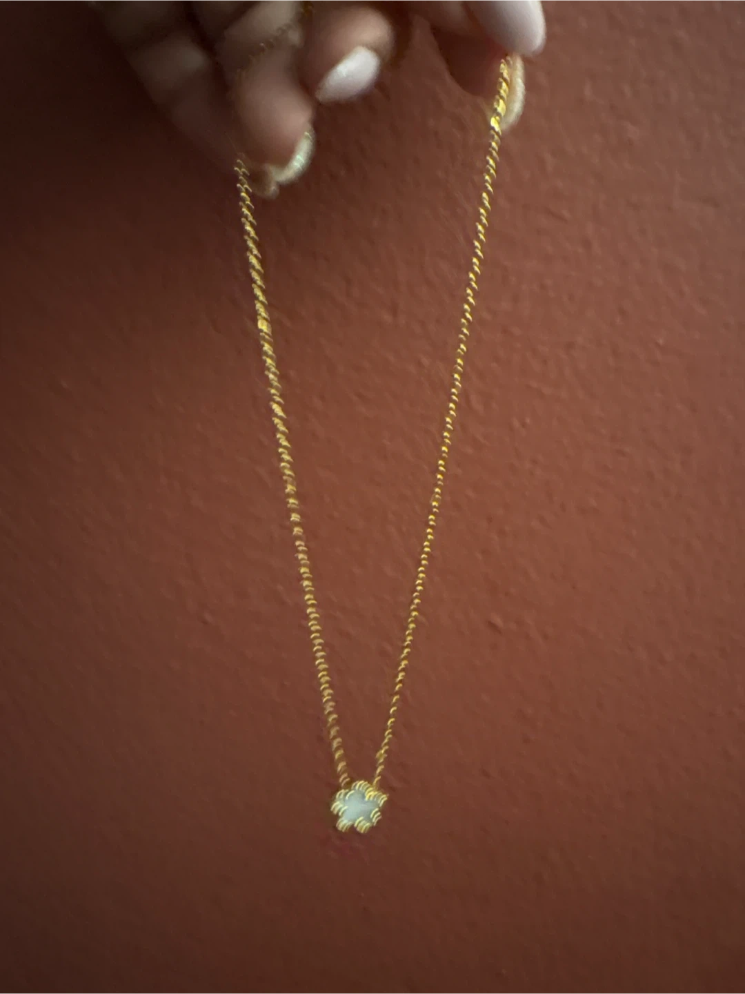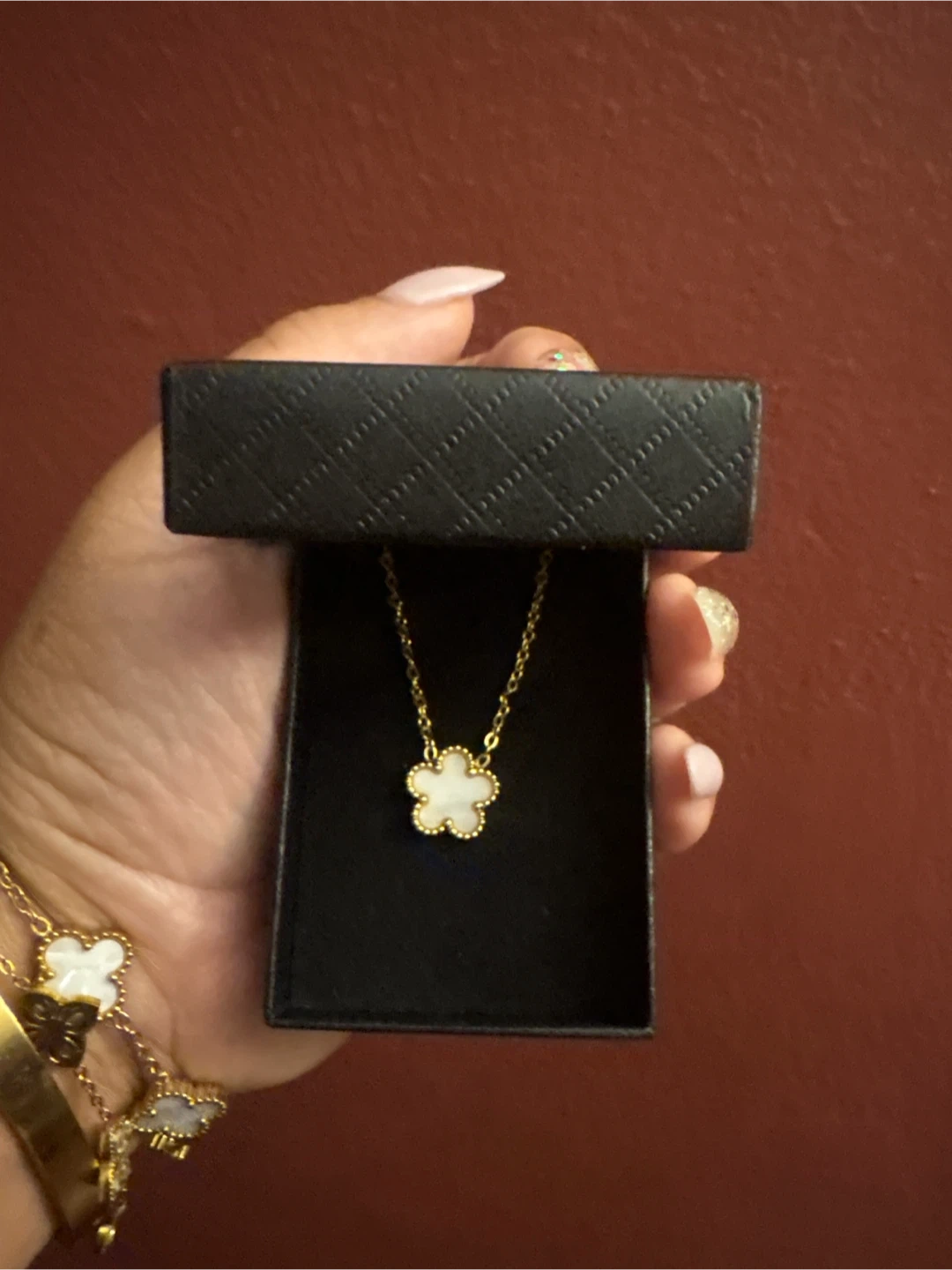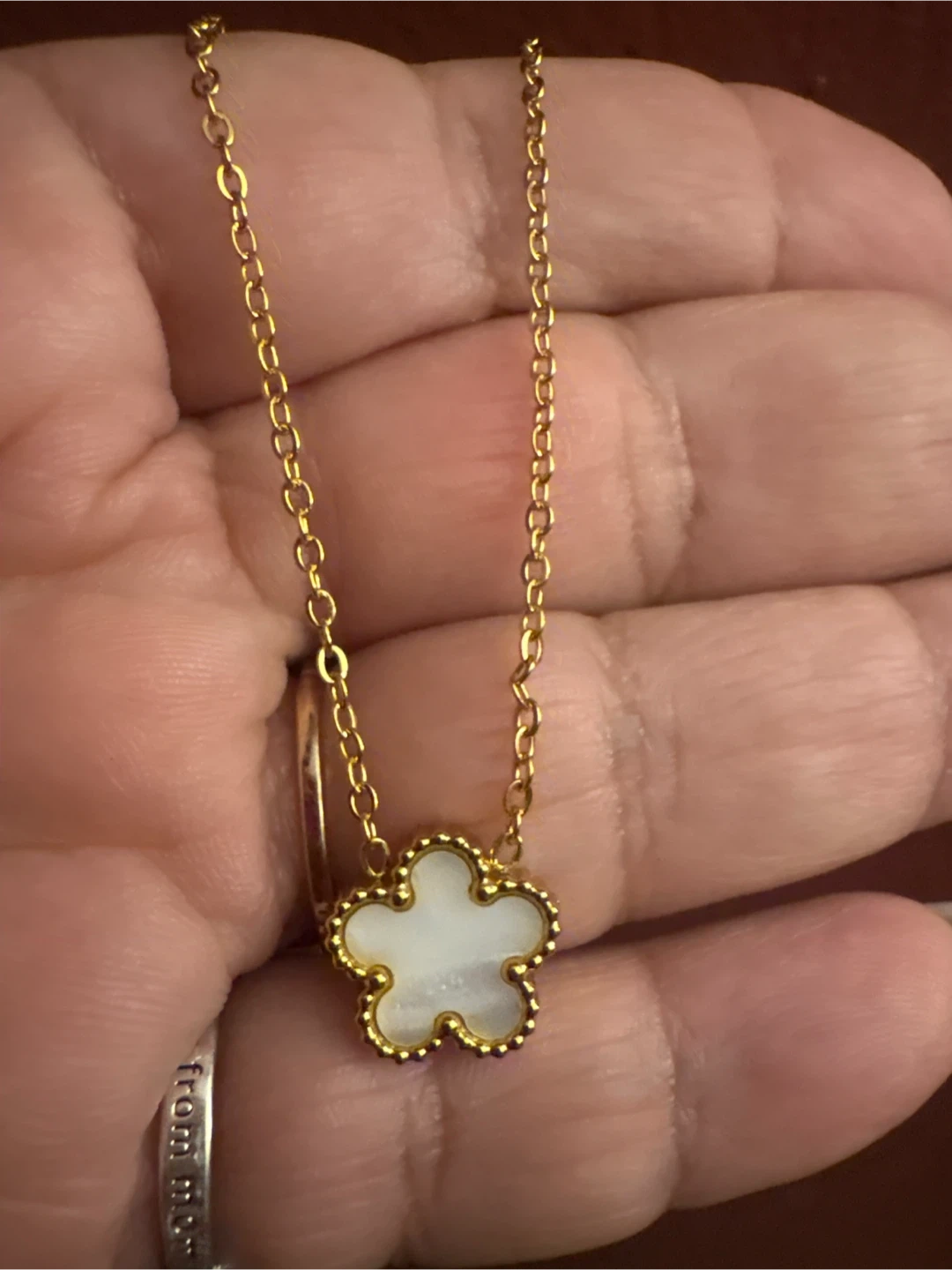 Selling a cute 18k SS gold necklace with a white mother of pearl flower pendant! It comes in its original box. The necklace is ready for a new home