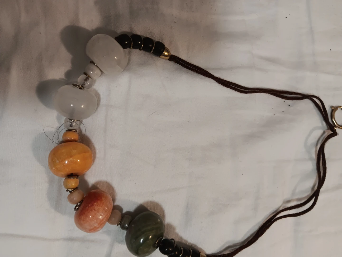 This beaded necklace features a mix of smooth, colourful beads. It has large translucent white beads, an orange carved bead, and a mottled green bead. The necklace is strung on brown cord with a gold-toned clasp.