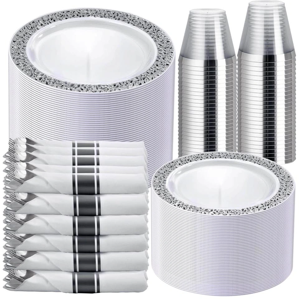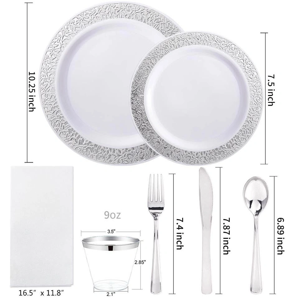 Silver Disposable Dinnerware Set New in box Pickup is in Ajax, close to harwood bayly intersection. 350-piece complete party pack Includes: 50 dinner plates, 50 dessert plates, 50 cups 50 pre-rolled napkins with silver cutlery Food-grade, BPA-free, non-toxic plastic Unique silver lace design adds elegance Disposable for quick and easy cleanup Great for weddings, birthdays, and parties