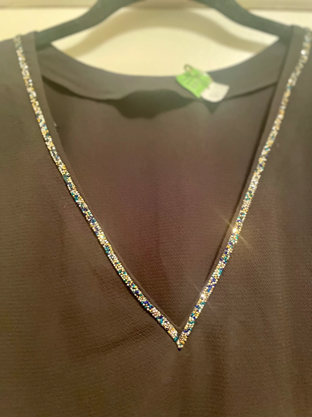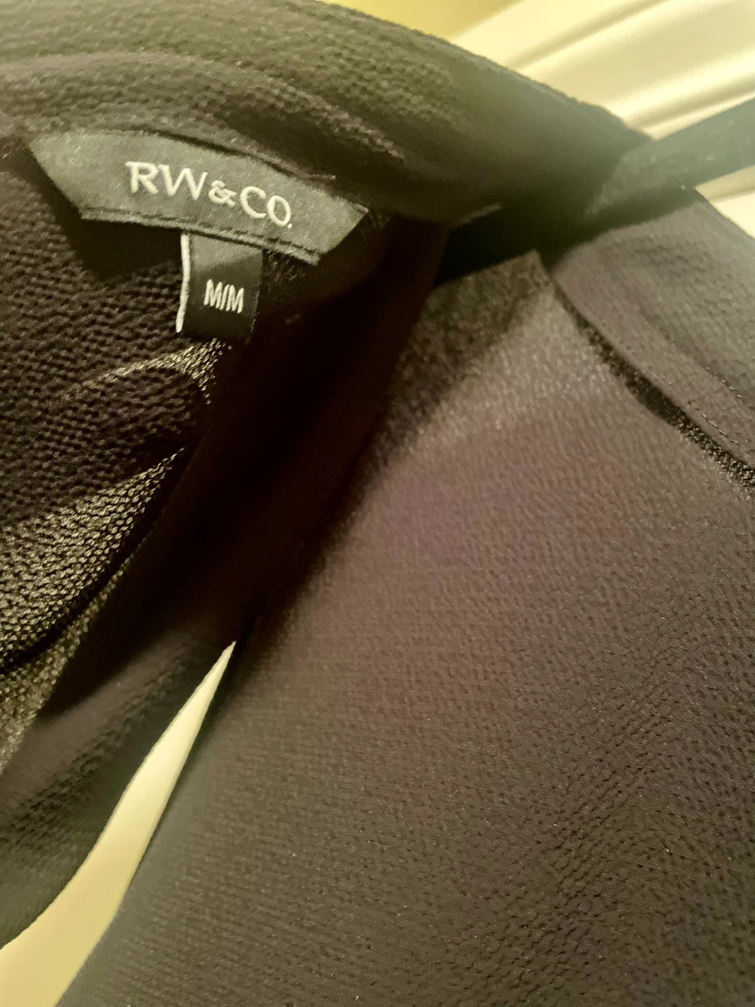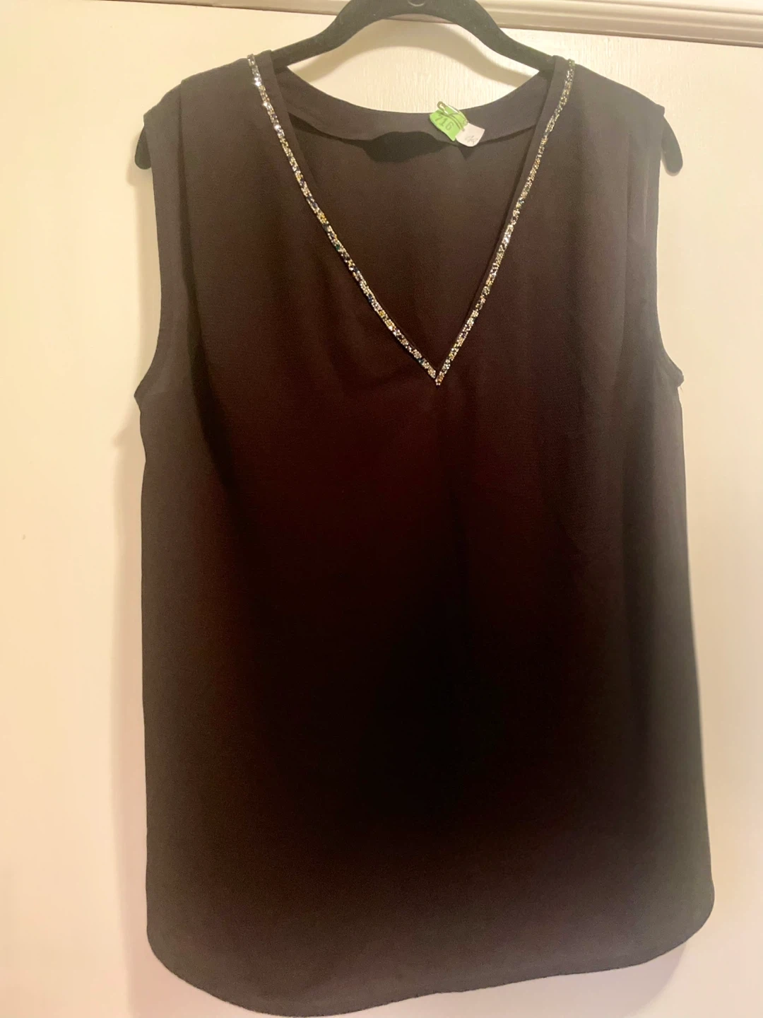 Selling a gently used black sleeveless top from RW&CO. It features a stylish V-neckline with decorative trim. The size is M/M.