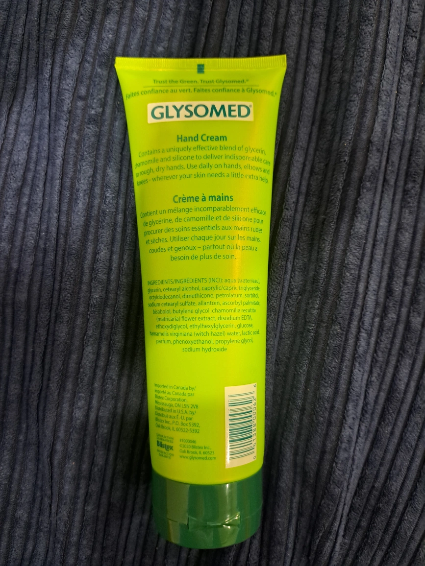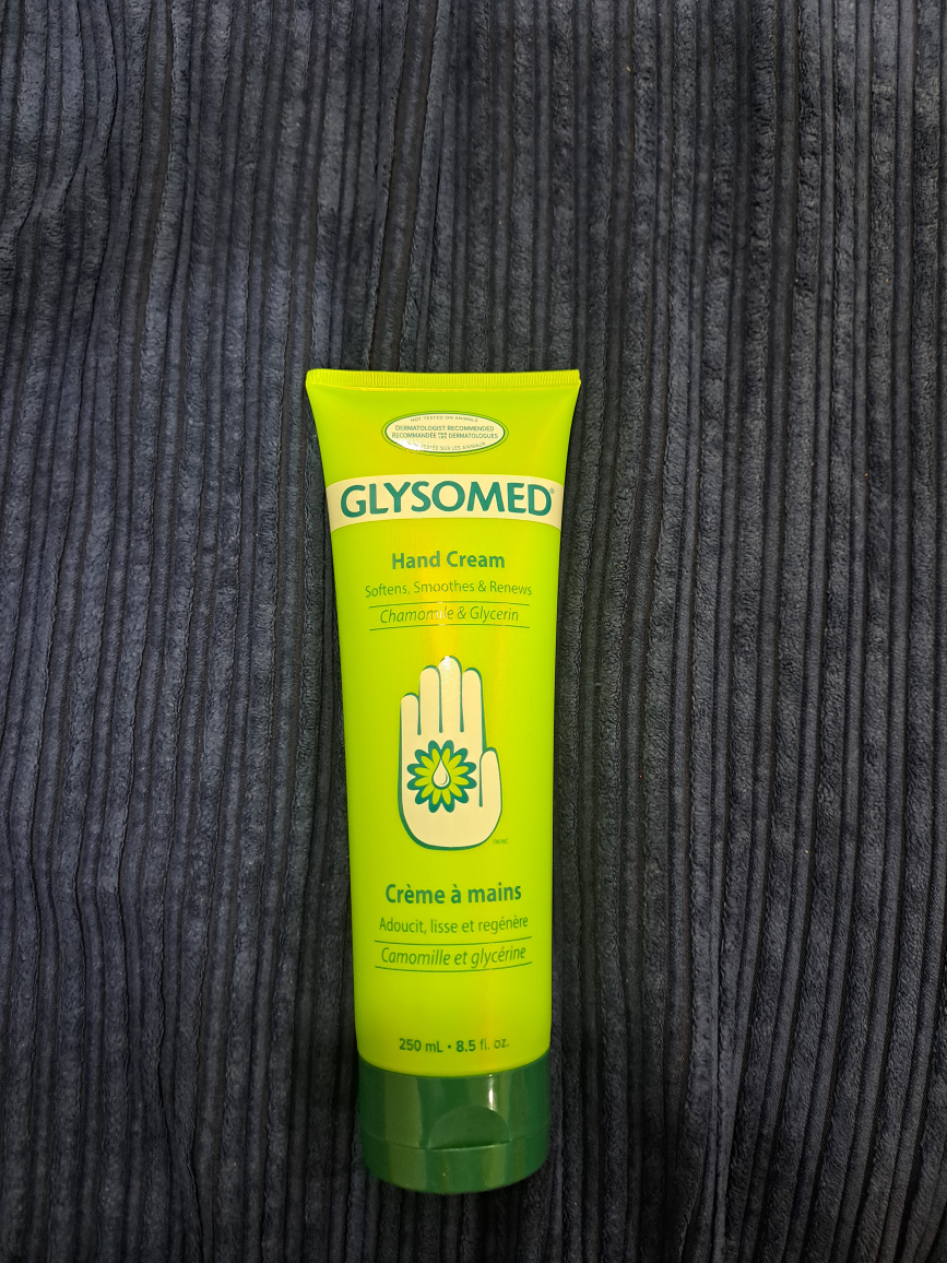I'm selling a tube of Glysomed Hand Cream! This cream softens, smoothes, and renews skin with chamomile and glycerin. It's a 250ml tube, perfect for keeping your hands moisturized. Contains a unique blend of glycerin, chamomile, and silicone to deliver indispensable care to rough, dry hands. Use daily on hands, elbows, and knees—wherever your skin needs a little extra help. This product has not been used at all.