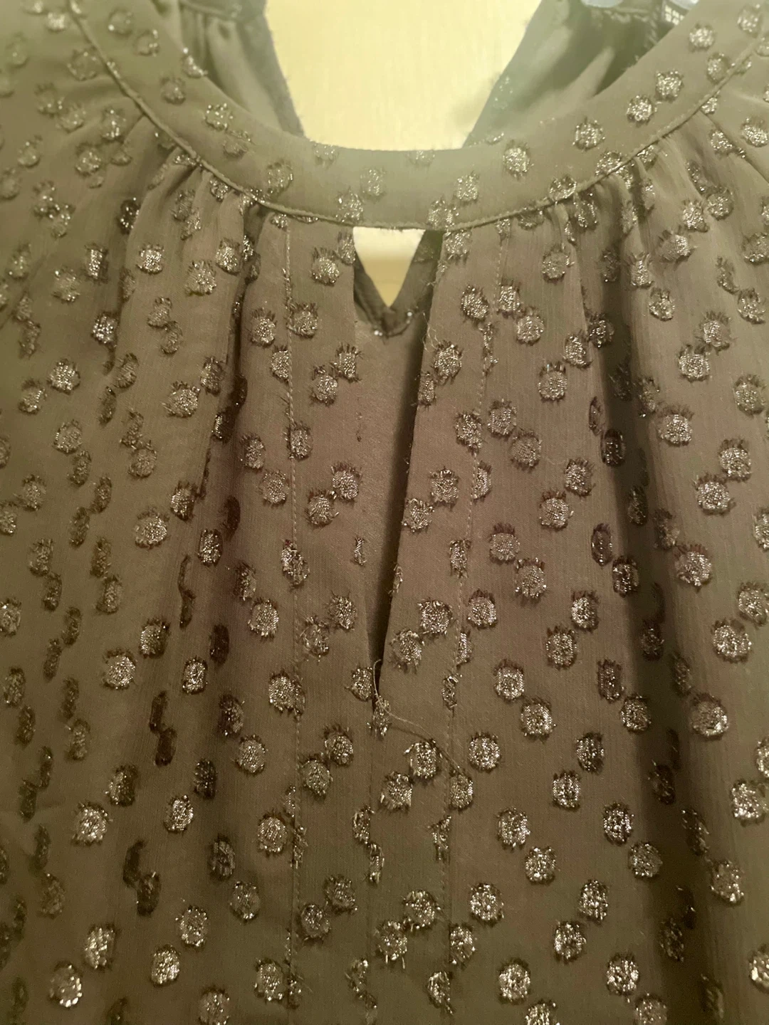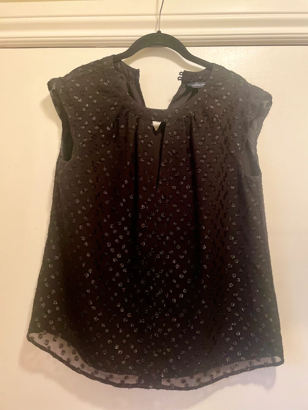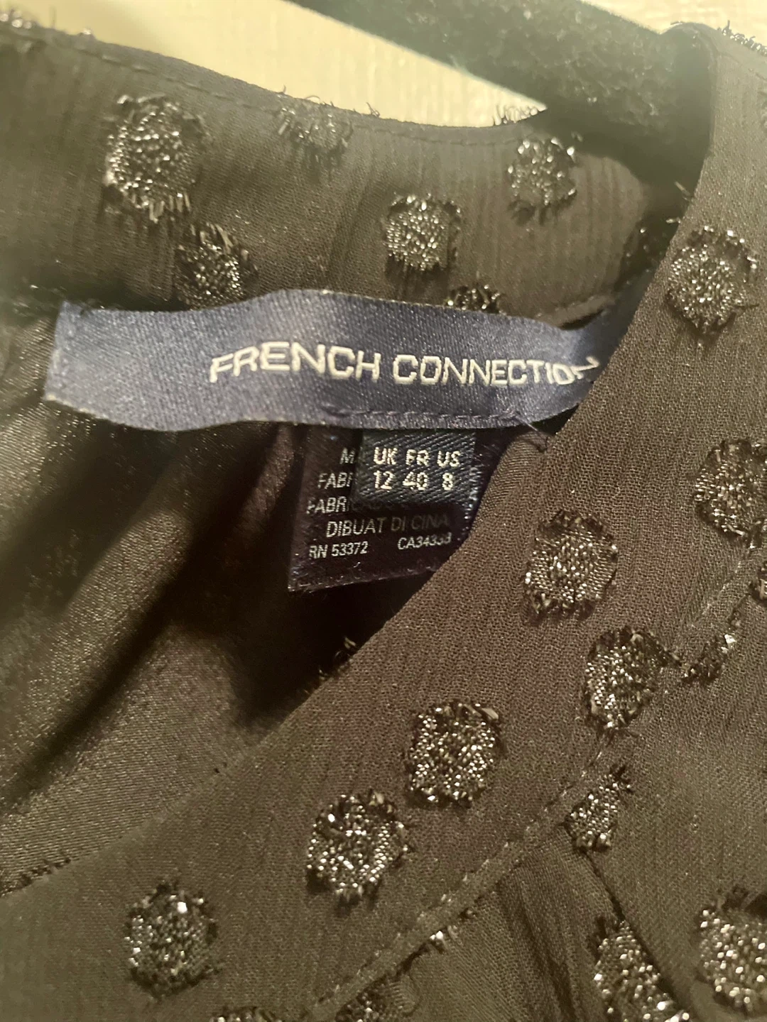 A stylish black top from French Connection, perfect for any occasion! This top is a size medium and features a unique dotted pattern throughout. It's in great condition and ready for a new home