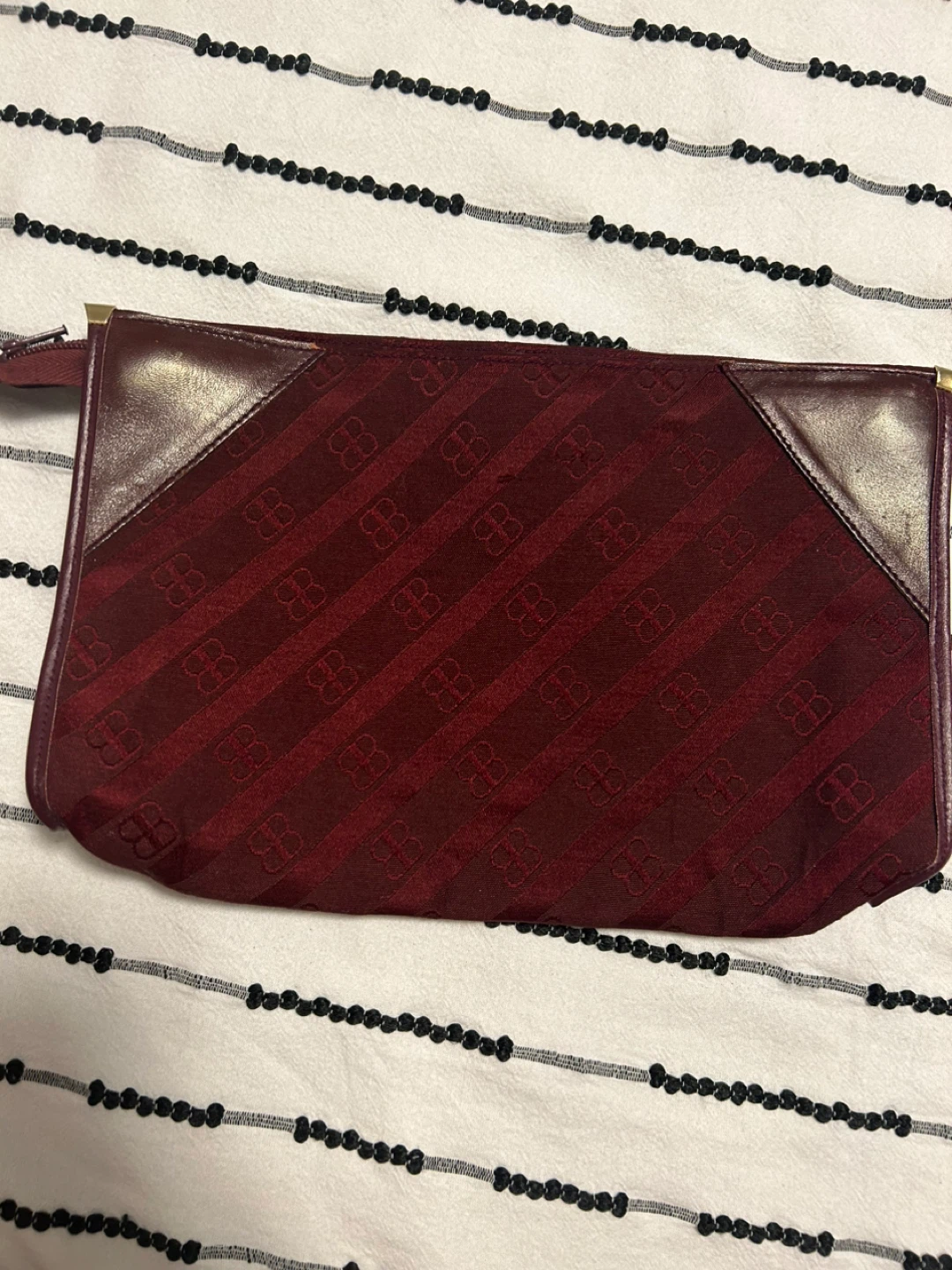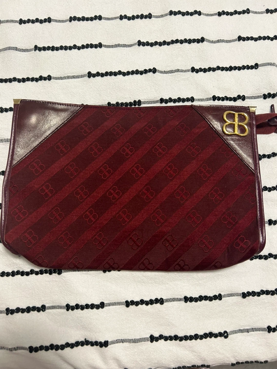 Selling a Balenciaga clutch bag. It features a unique pattern with the Balenciaga logo. The colour is a lovely burgundy. It's in great condition and ready for a new home. I invite you to view my other items; If you are interested in any of them, I will give you a better price.