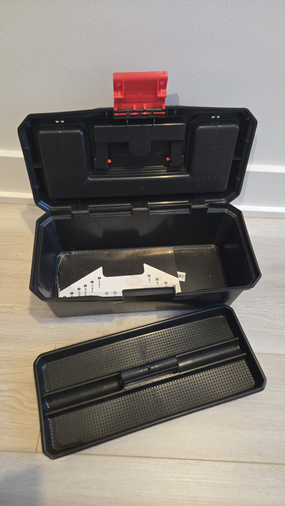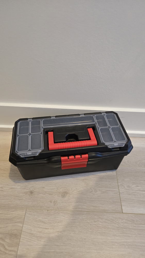Selling a black tool box with a red handle. It's in great shape and ready to organize your tools! It has a removable tray inside for smaller items and compartments on top for easy access to screws, bolts, etc