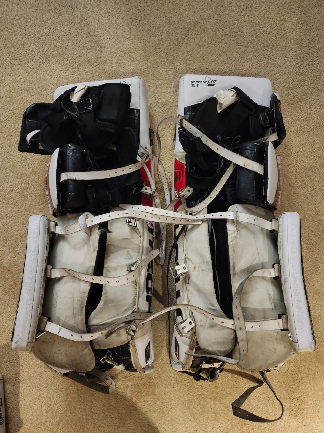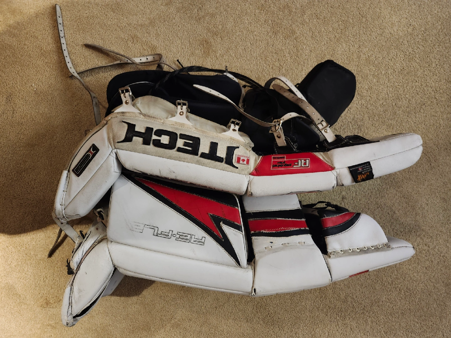 96Selling a pair of RX9 SR Pro ITECH goalie pads 35+1" with integrated knee pads. They show signs of wear, but are still functional. Great for recreational hockey! Matching glove and block also available.