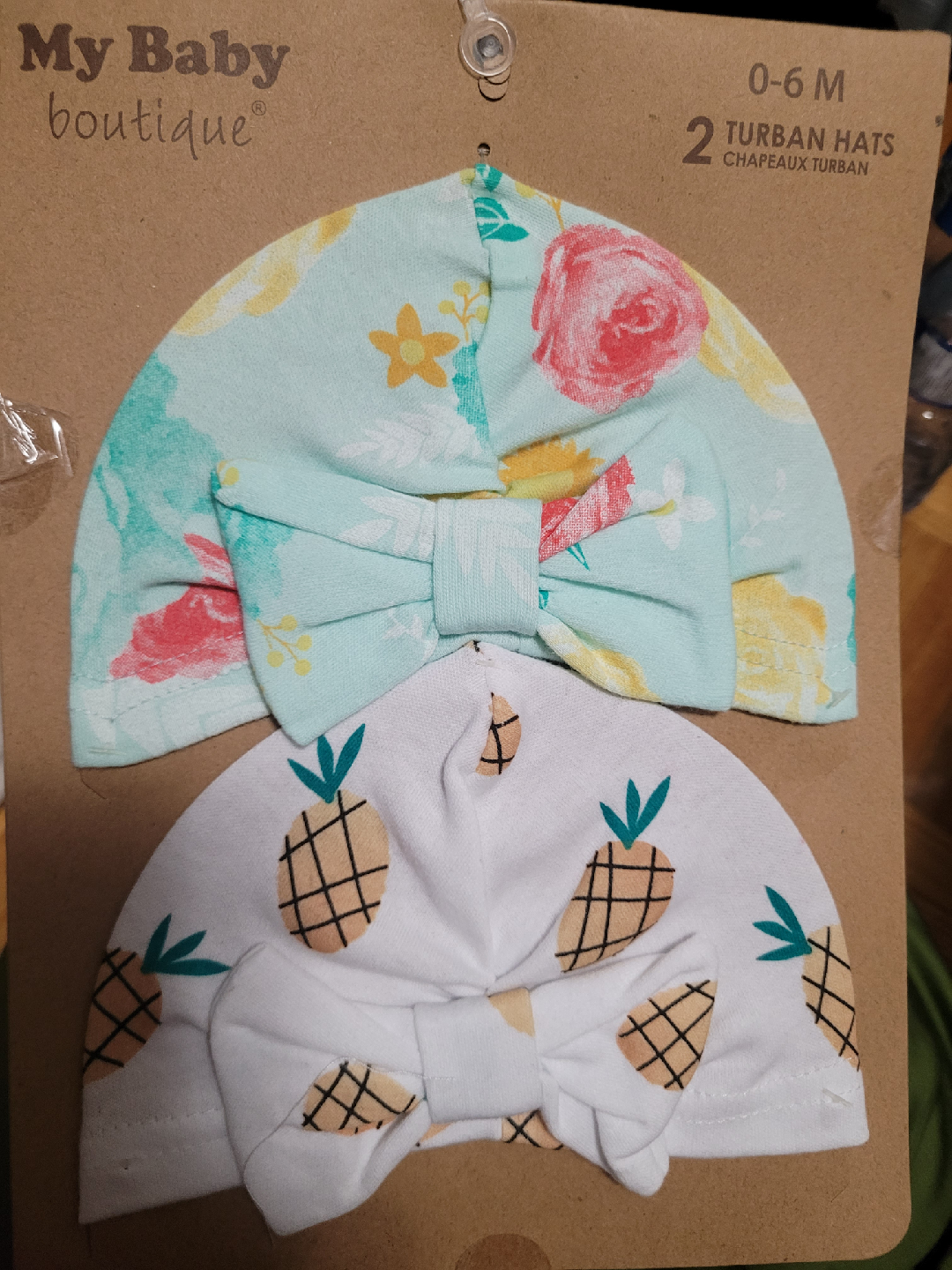 These adorable turban hats from My Baby Boutique are perfect for little ones aged 0-6 months! The set includes two hats with cute designs: one with a floral pattern and another with a pineapple print. They are made of 100% cotton, so they're soft and comfy for your baby