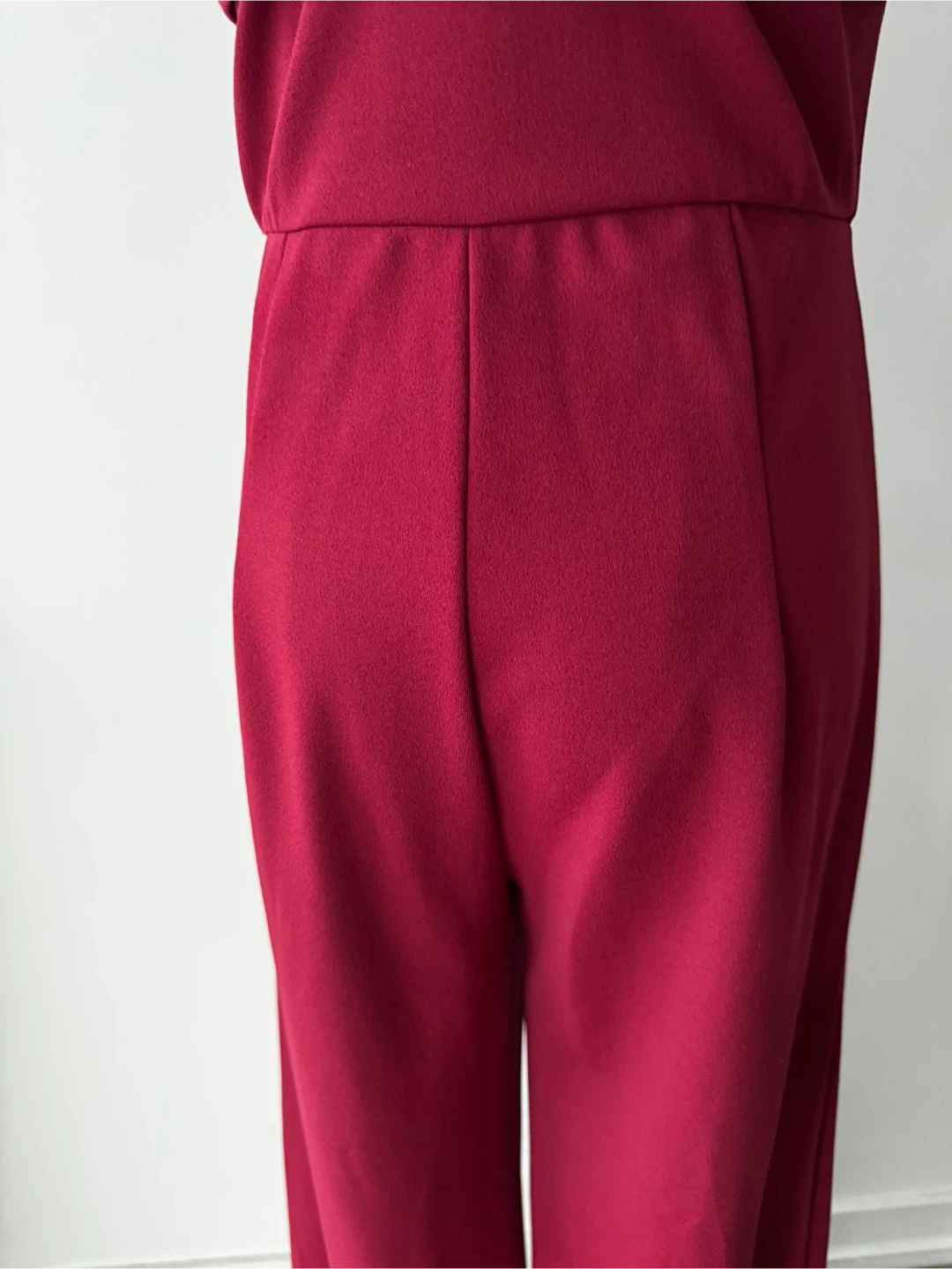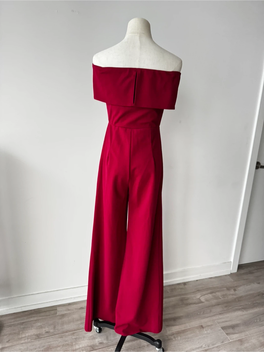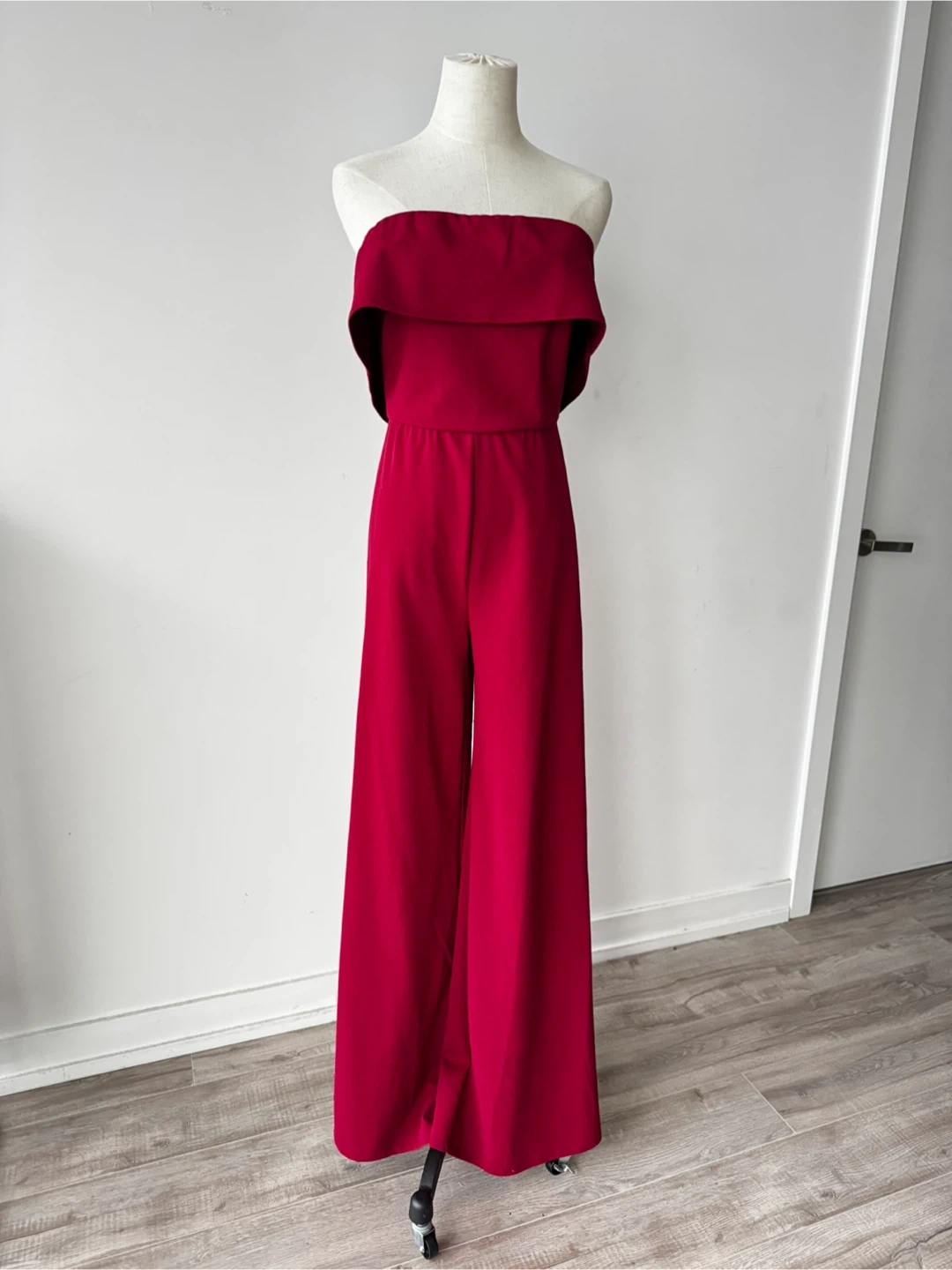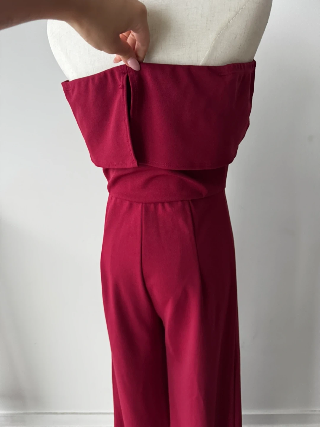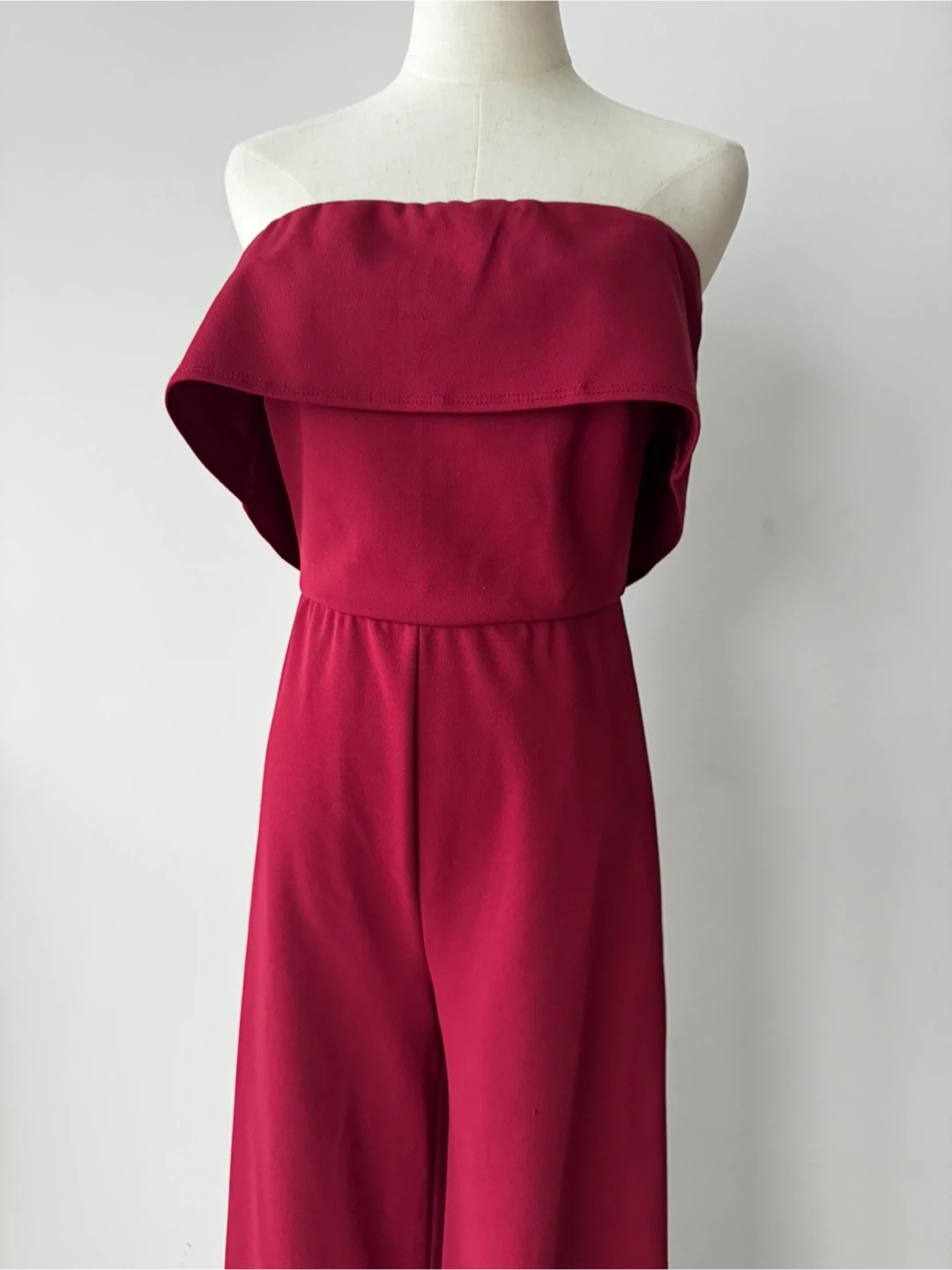 Here's a lovely burgundy strapless jumpsuit! It's in great condition and perfect for a night out or a special occasion. The wide-leg design is super flattering and comfortable too