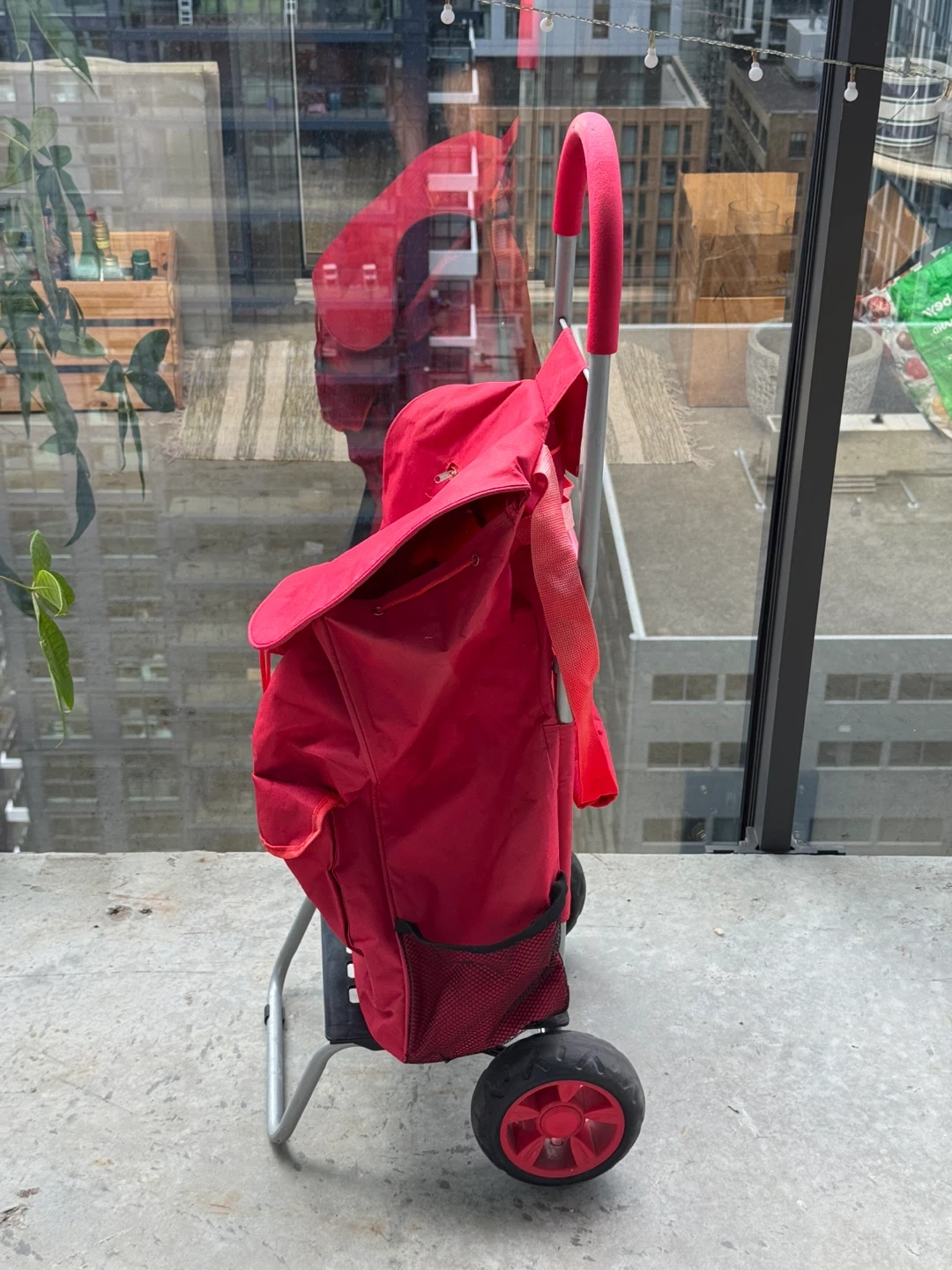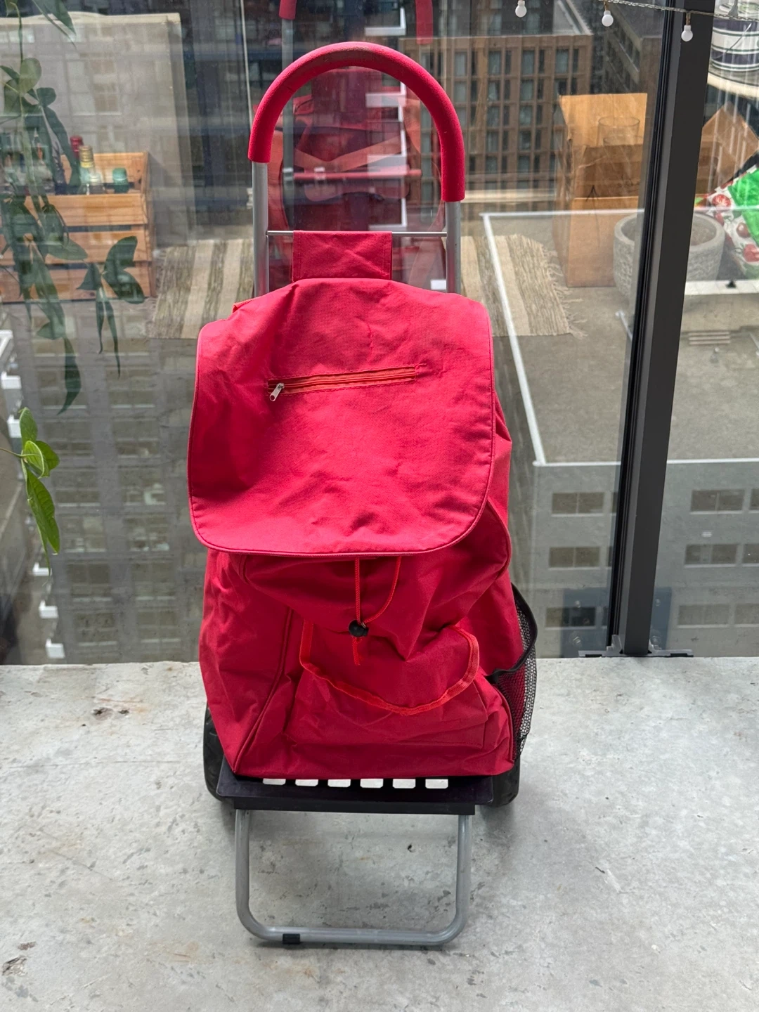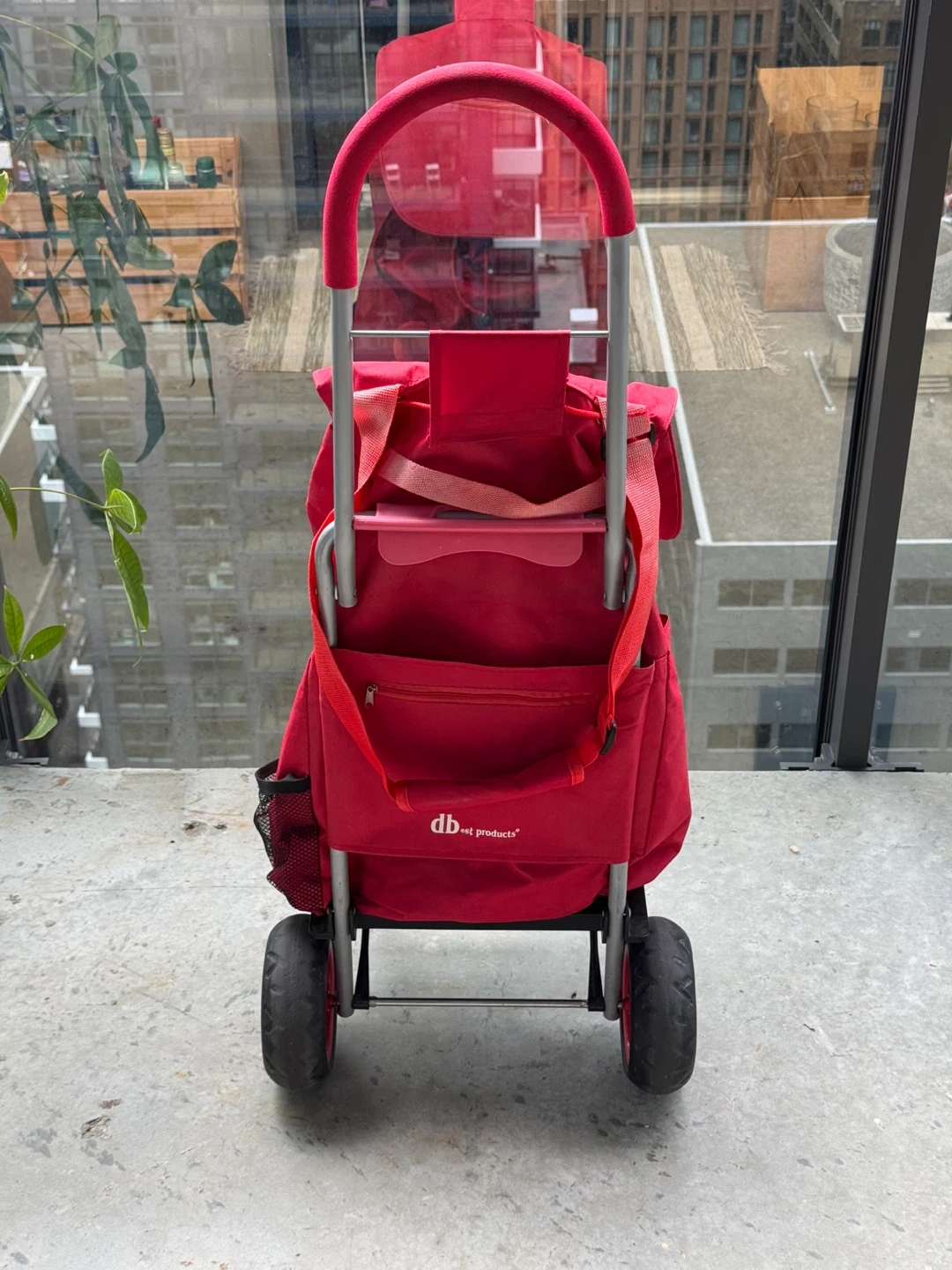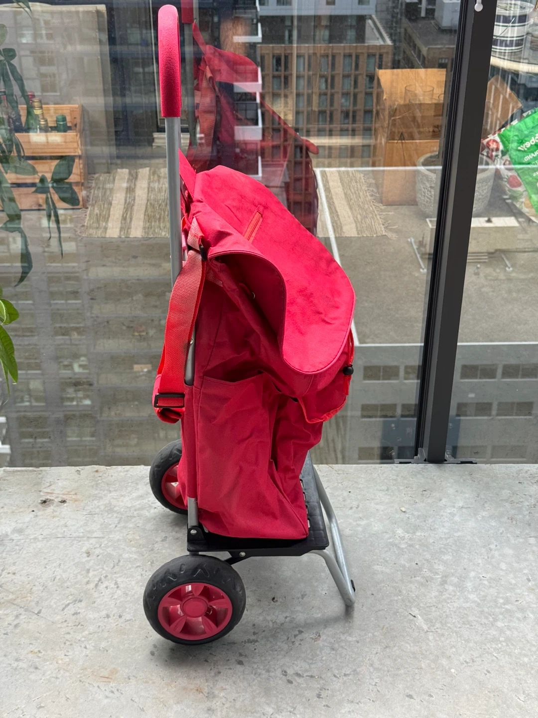 This is a red backpack trolley by db-est products. It features a backpack attached to a trolley with wheels and a retractable handle. Perfect for carrying items with ease!