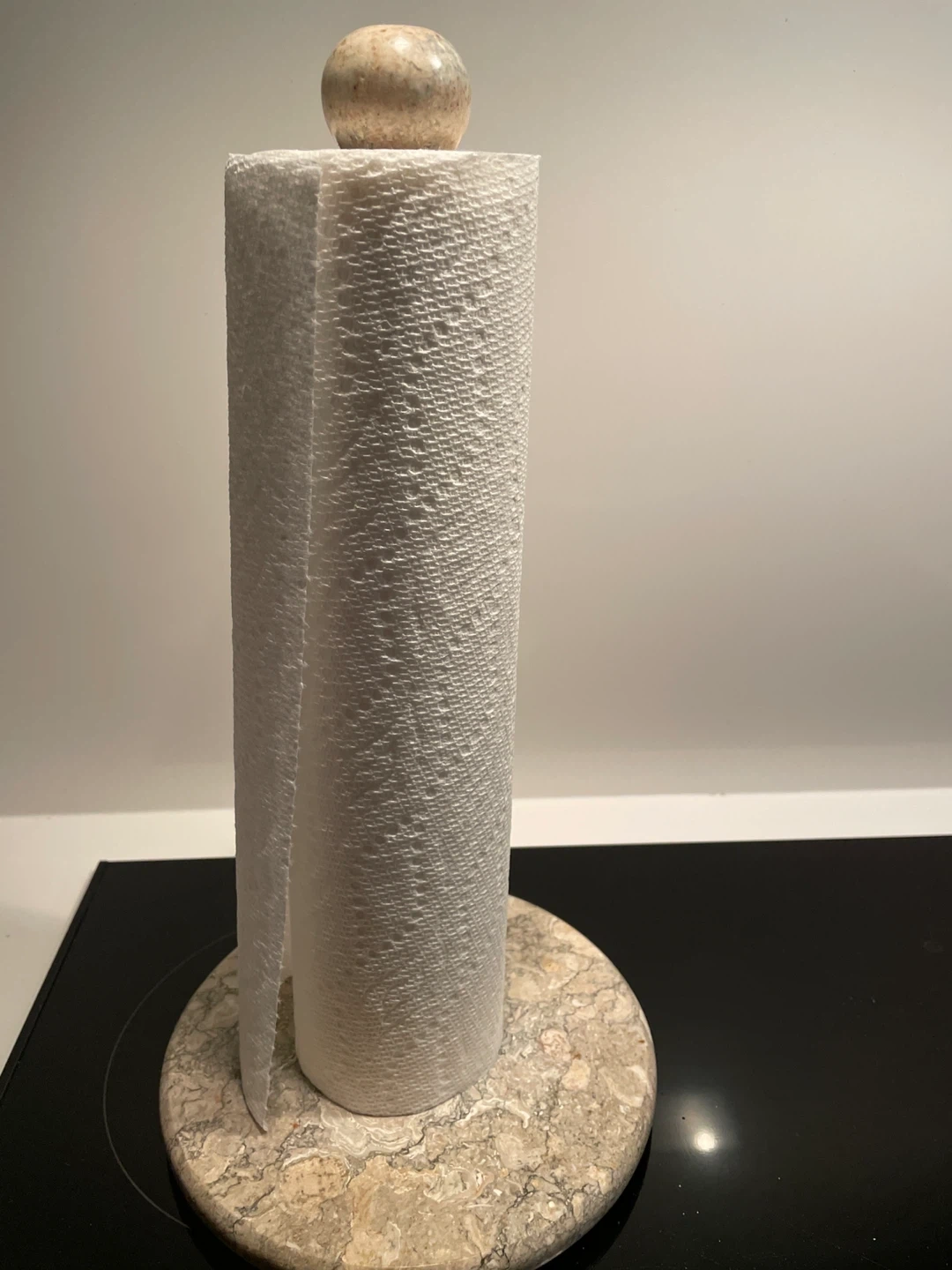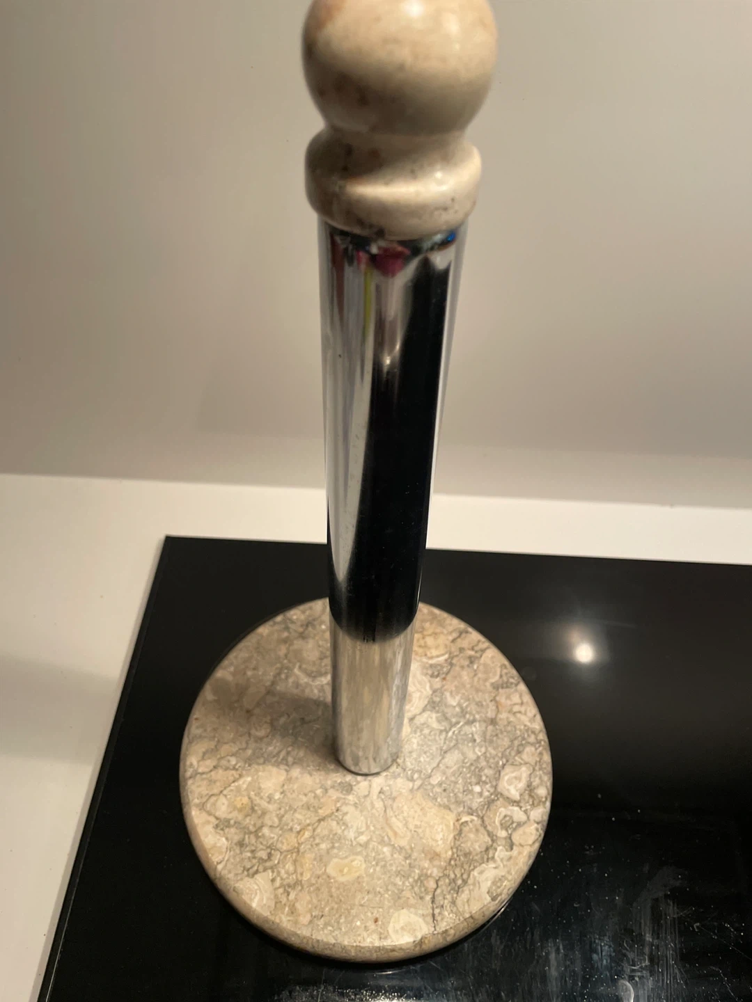 Here's a stylish paper towel holder with a marble base and top! It adds a touch of elegance to any kitchen. Perfect for keeping your paper towels organized and within easy reach