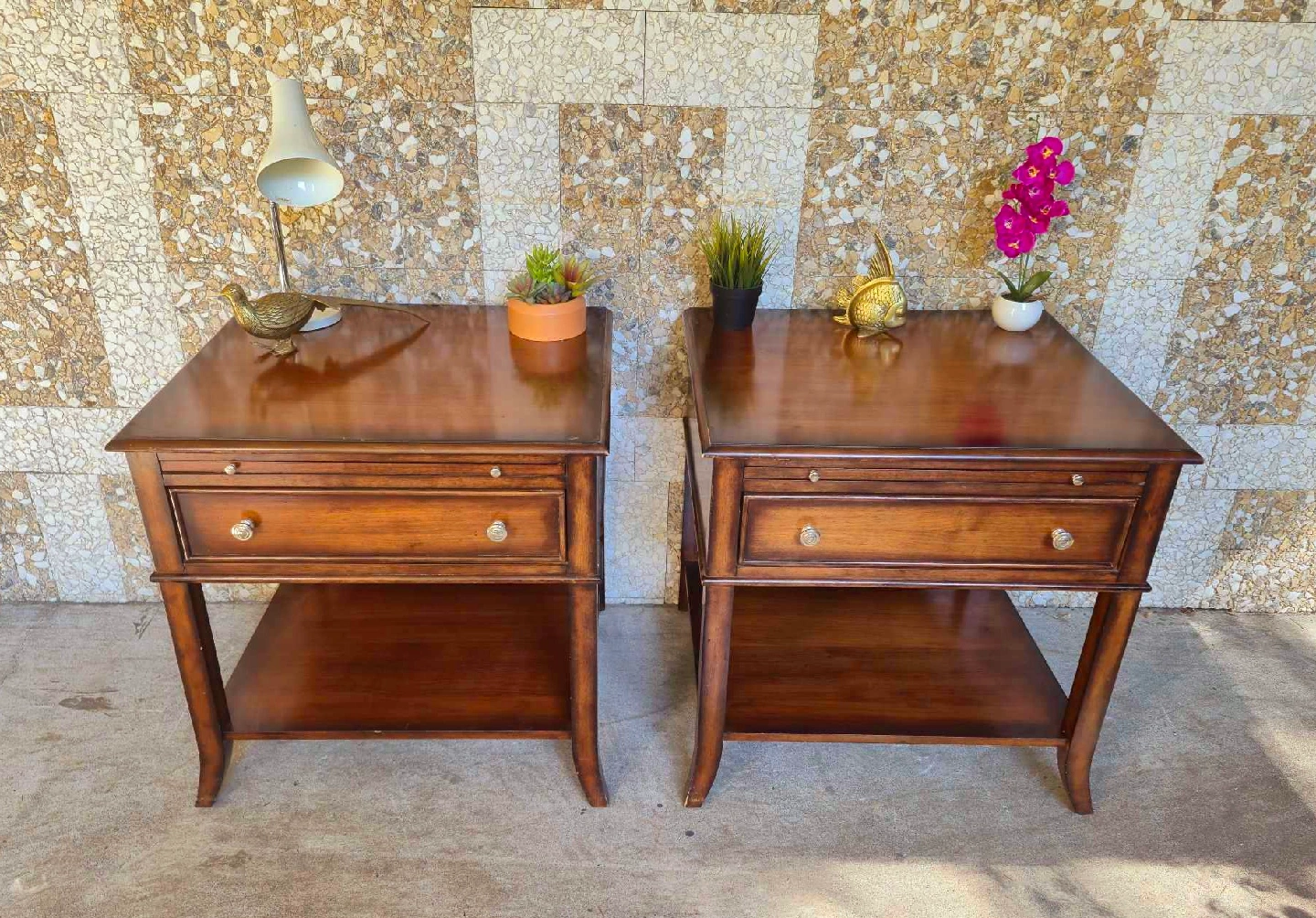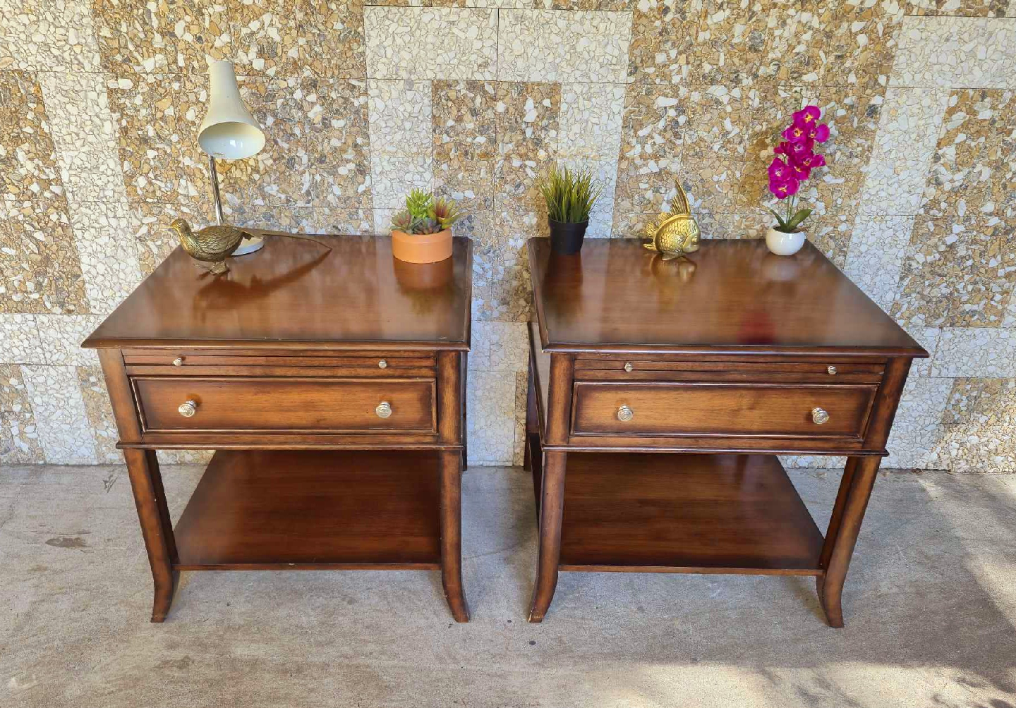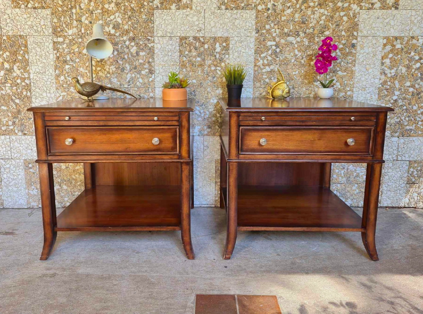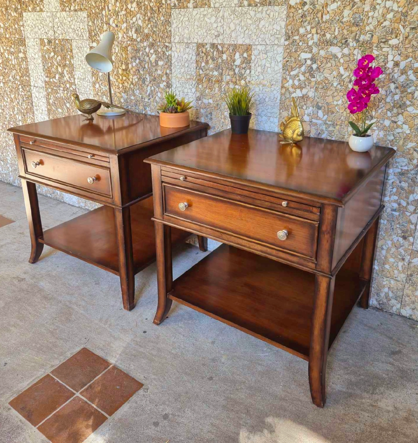Pair Of Solid Walnut Nightstands With Single Drawer And Pullout Tray