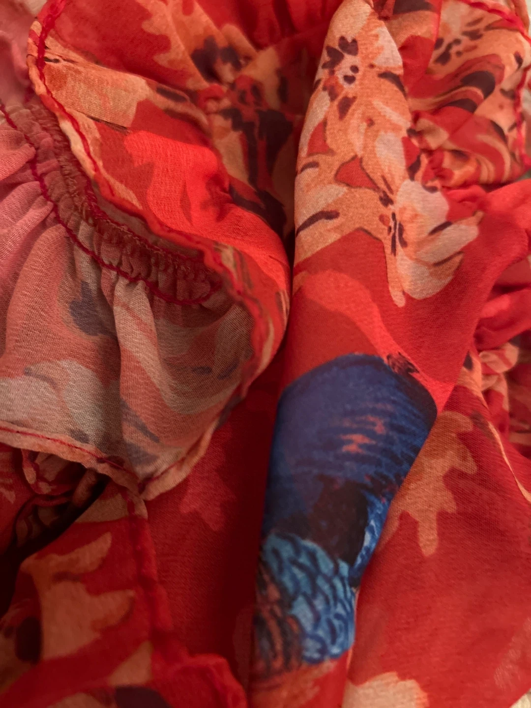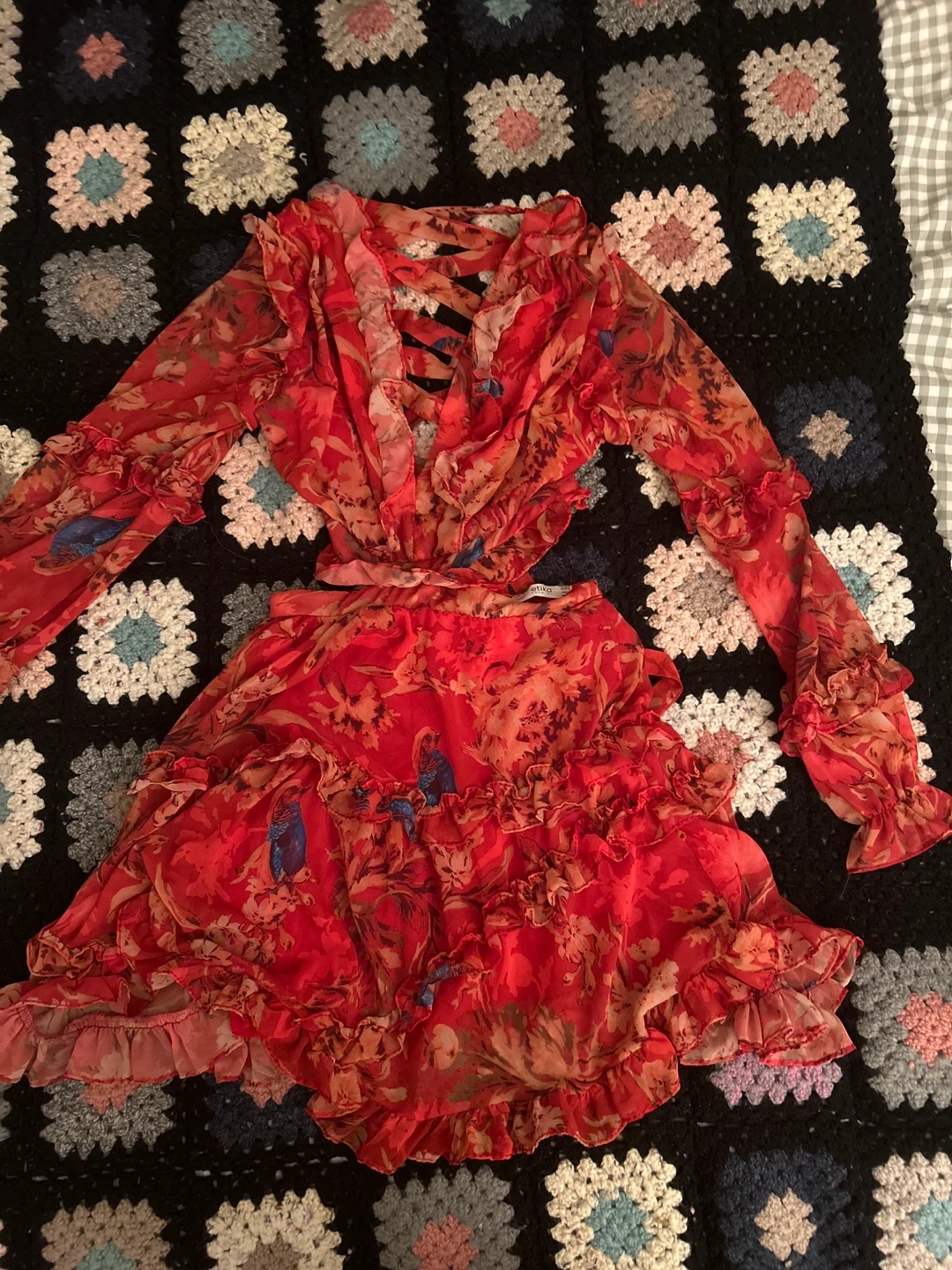 Selling a cute red floral two-piece set! It features a ruffled design and a unique pattern. Perfect for a stylish and comfortable look for any occasion