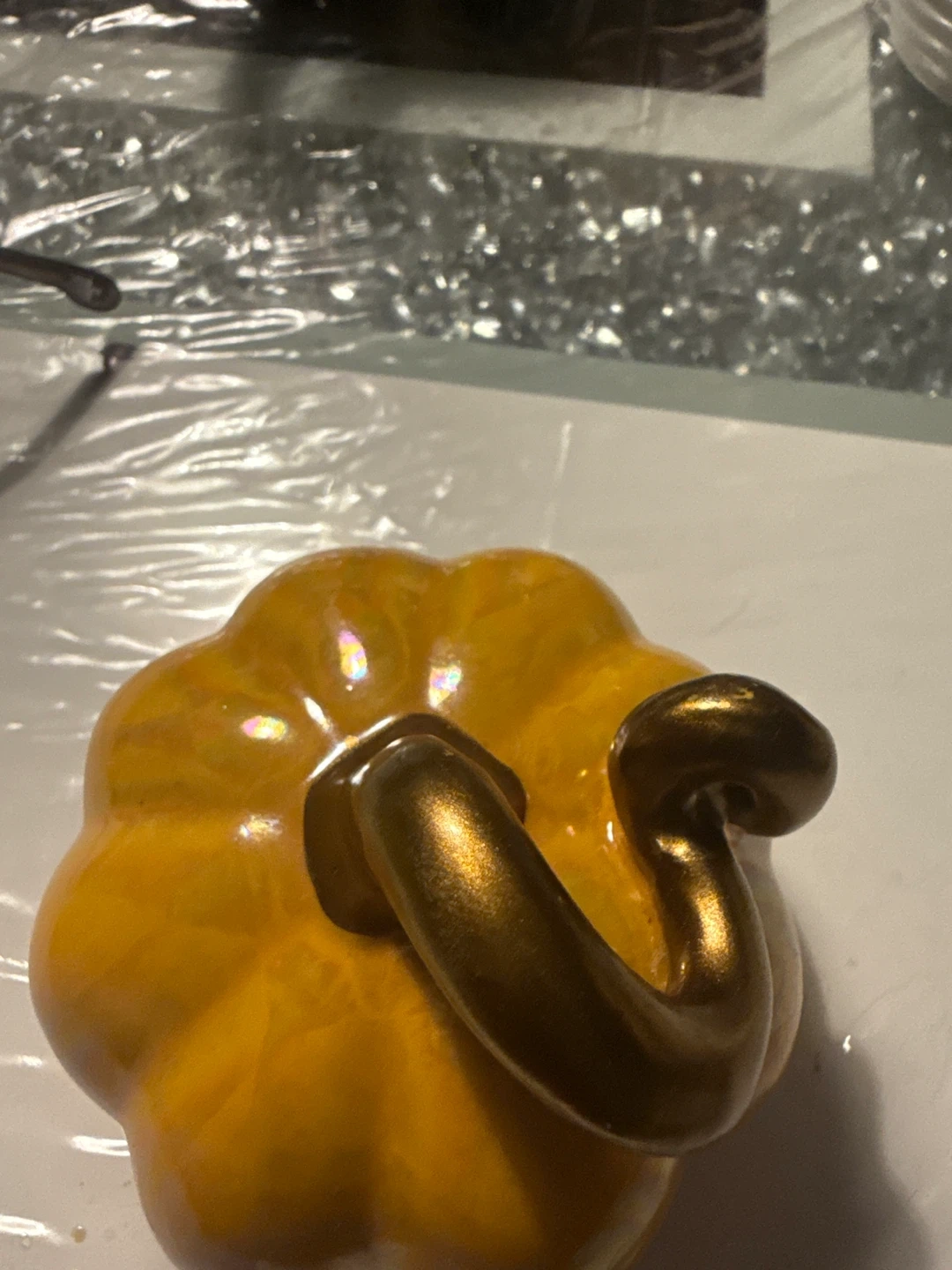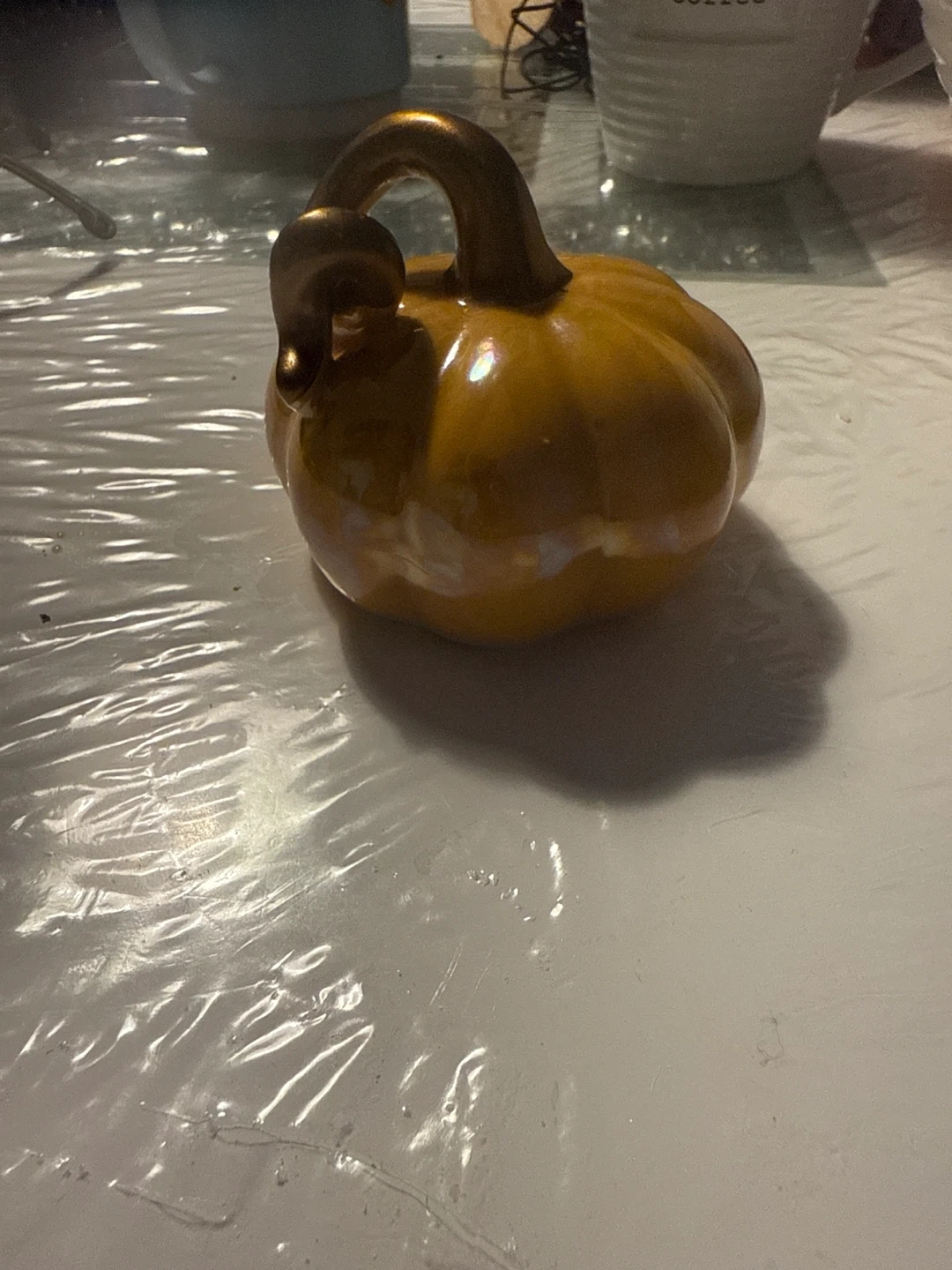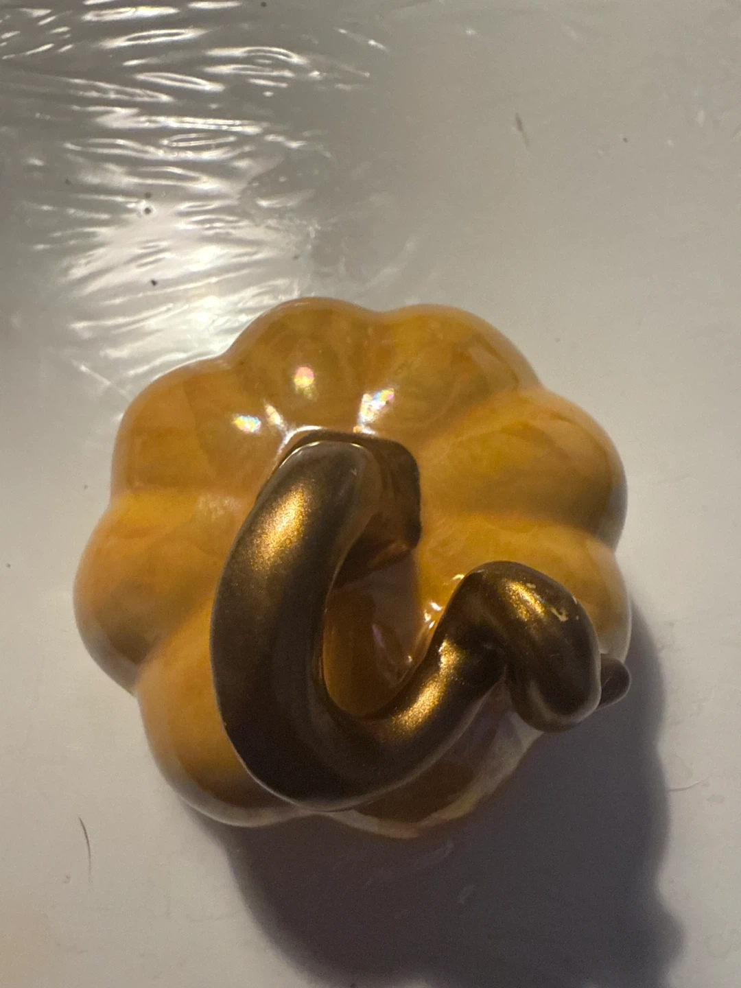 Cute ceramic pumpkin decoration! It has a gold stem and a lovely iridescent finish. Perfect for fall decor or just to add a touch of whimsy to your home.