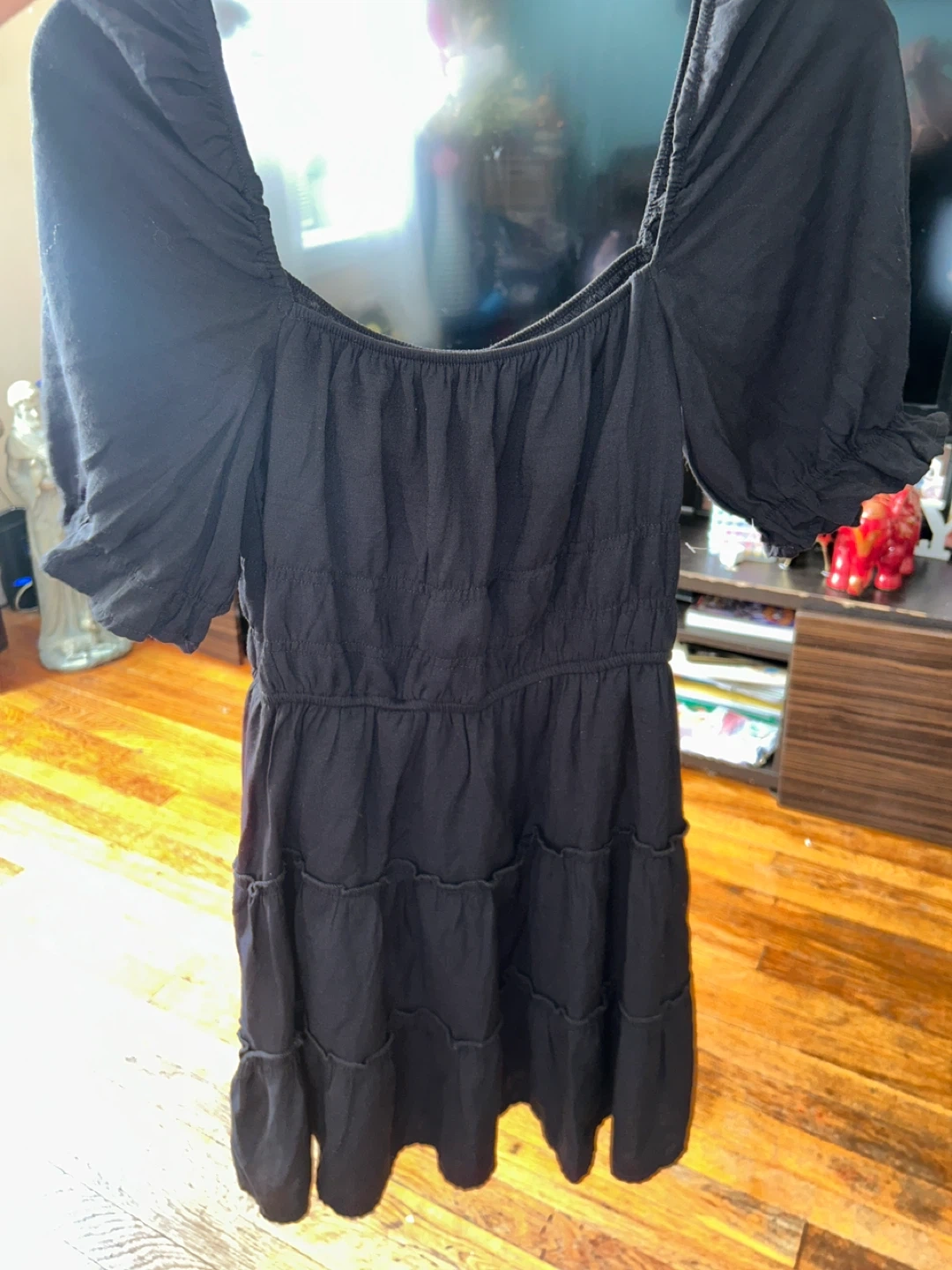 Selling a cute black tiered mini dress! It features a square neckline and short, puffy sleeves. Perfect for a casual day out or a summer evening