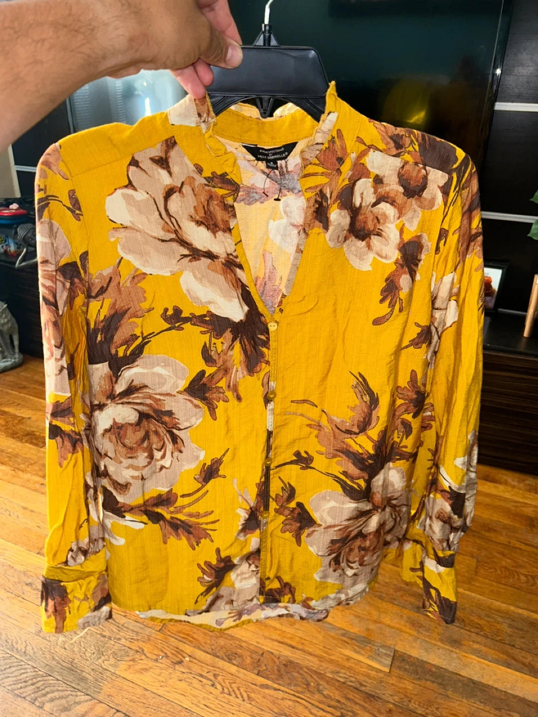 Profiling Walt Gonsellier blouse in a vibrant yellow with a beautiful floral pattern! This long-sleeved blouse is perfect for adding a pop of color to your wardrobe. It's in great condition and ready for a new home