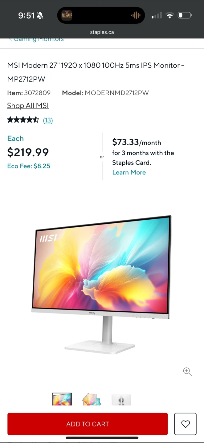 145Selling an MSI Modern 27" 1920 x 1080 100Hz 5ms IPS Monitor - MP2712PW in white. This monitor is in great condition and ready to use! It would be perfect for home or office use. Lightly used for a few months!