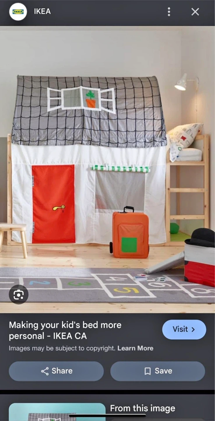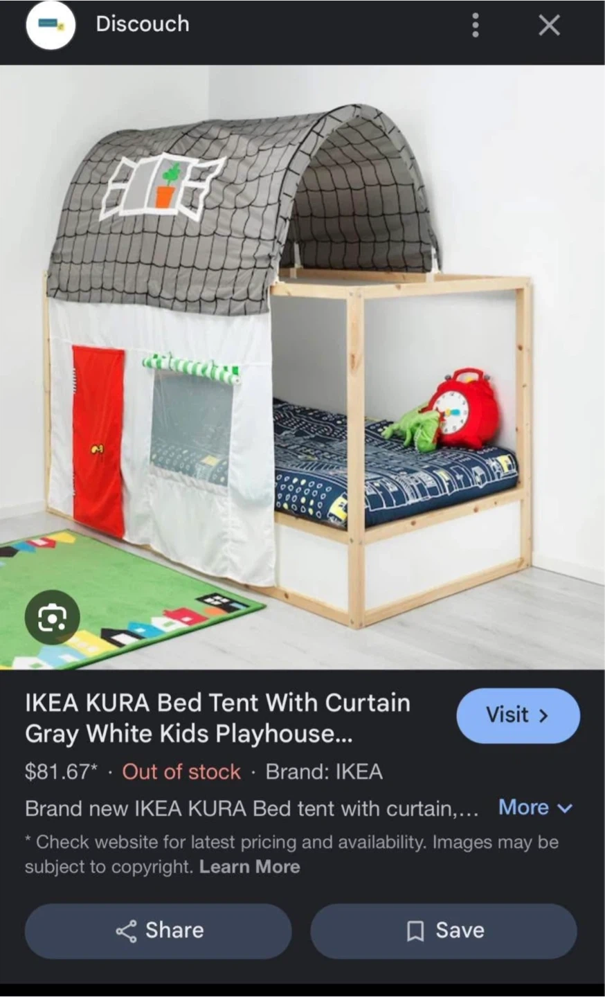 Selling an IKEA KURA bed tent with curtain! This is a super fun way to make your kid's bed more personal. It's in great shape, lightly used and ready for a new home. The tent has a cute little window and door, perfect for imaginative play. Discontinued at IKEA