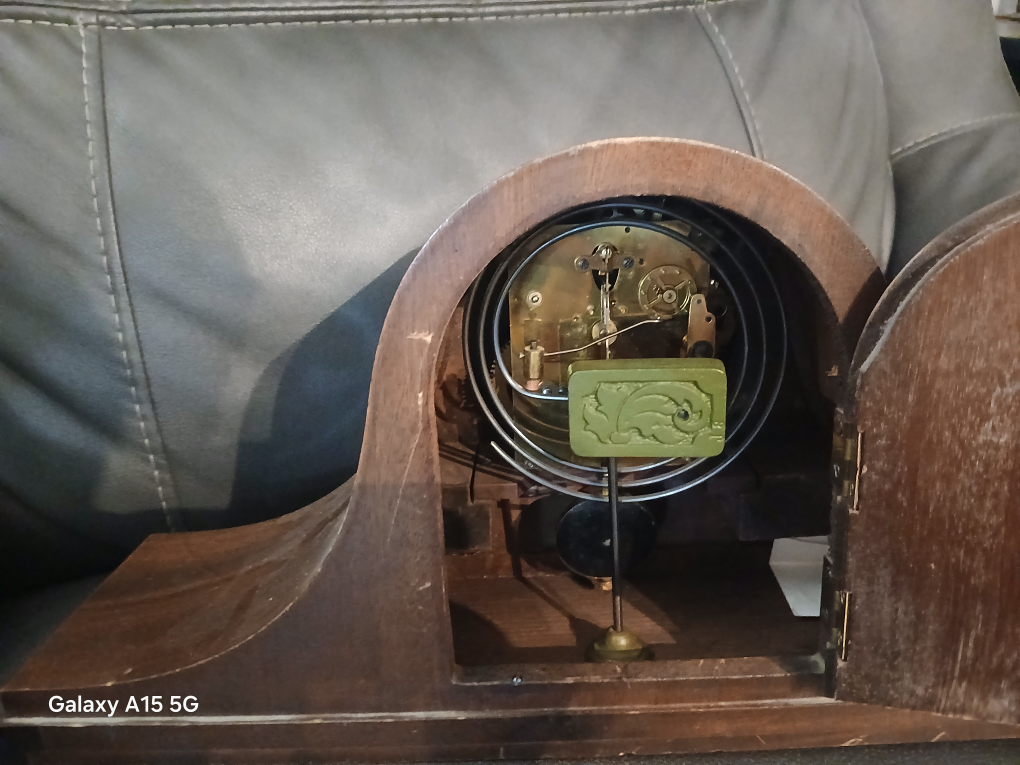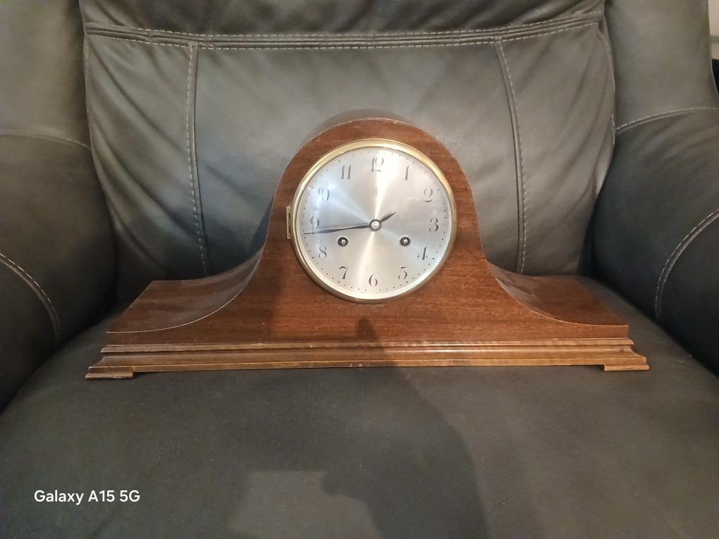 A 1920's Junghans wooden mantle clock! Excellent condition and works beautifully. It has a classic design that would look great on any shelf or mantle.
