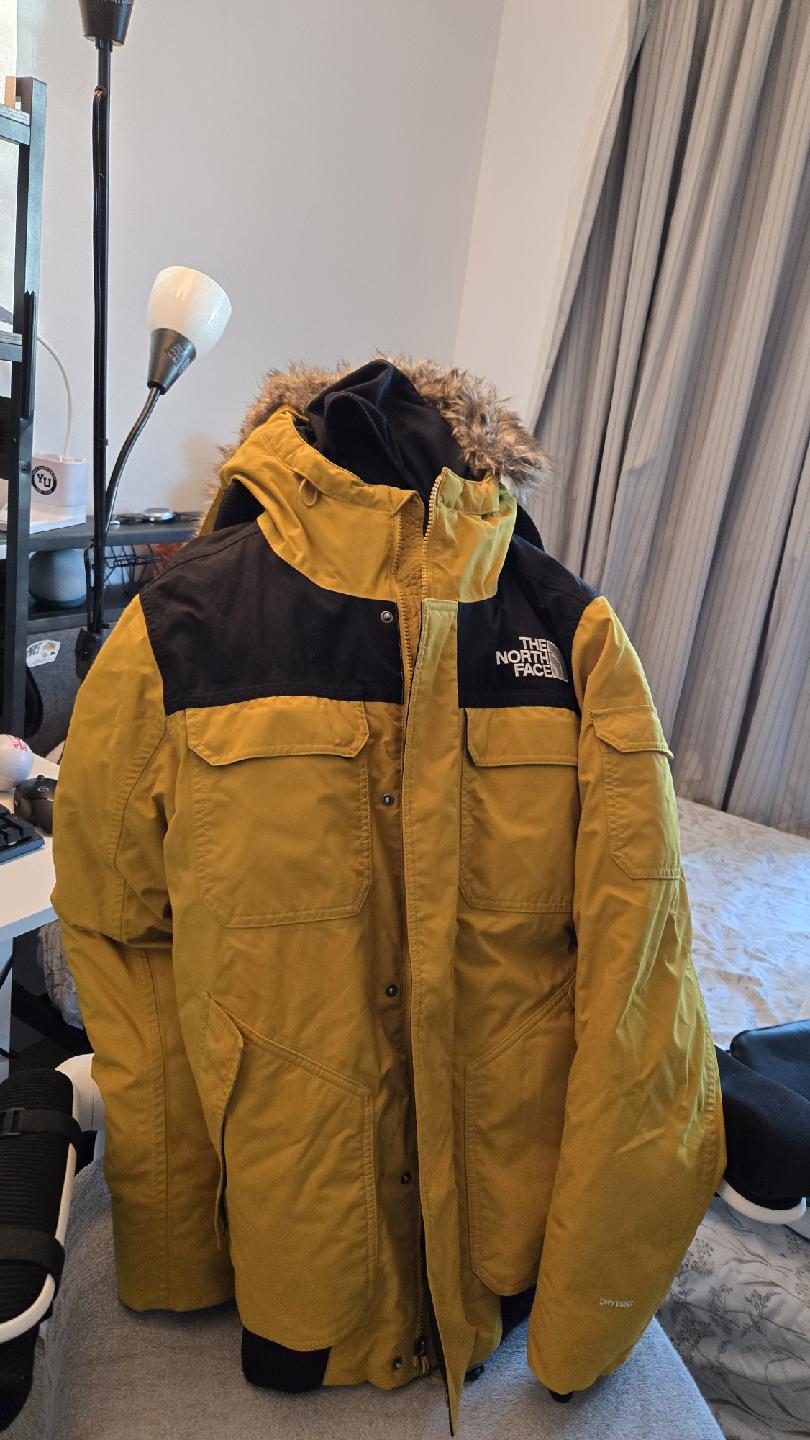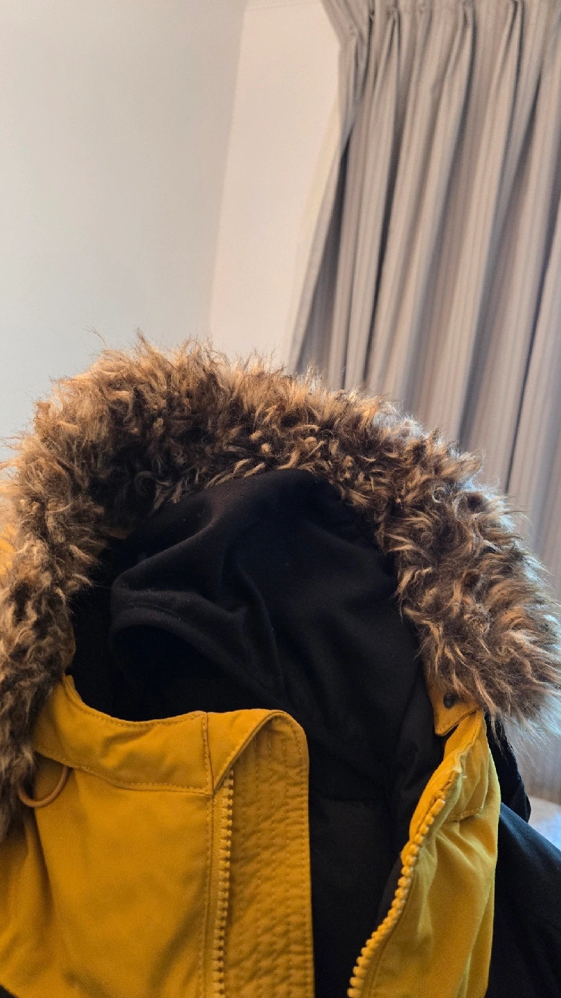 Selling a The North Face winter jacket in a nice yellow colour. It has a black upper section and a fur-lined hood. Perfect for staying warm during the colder months!