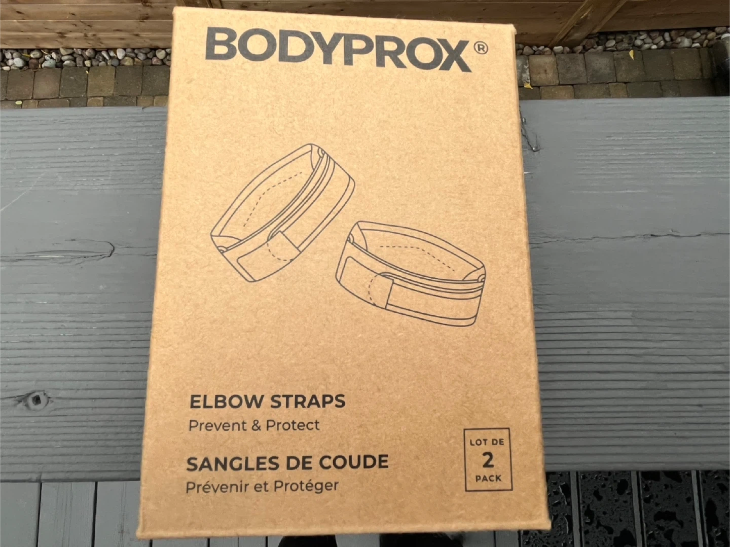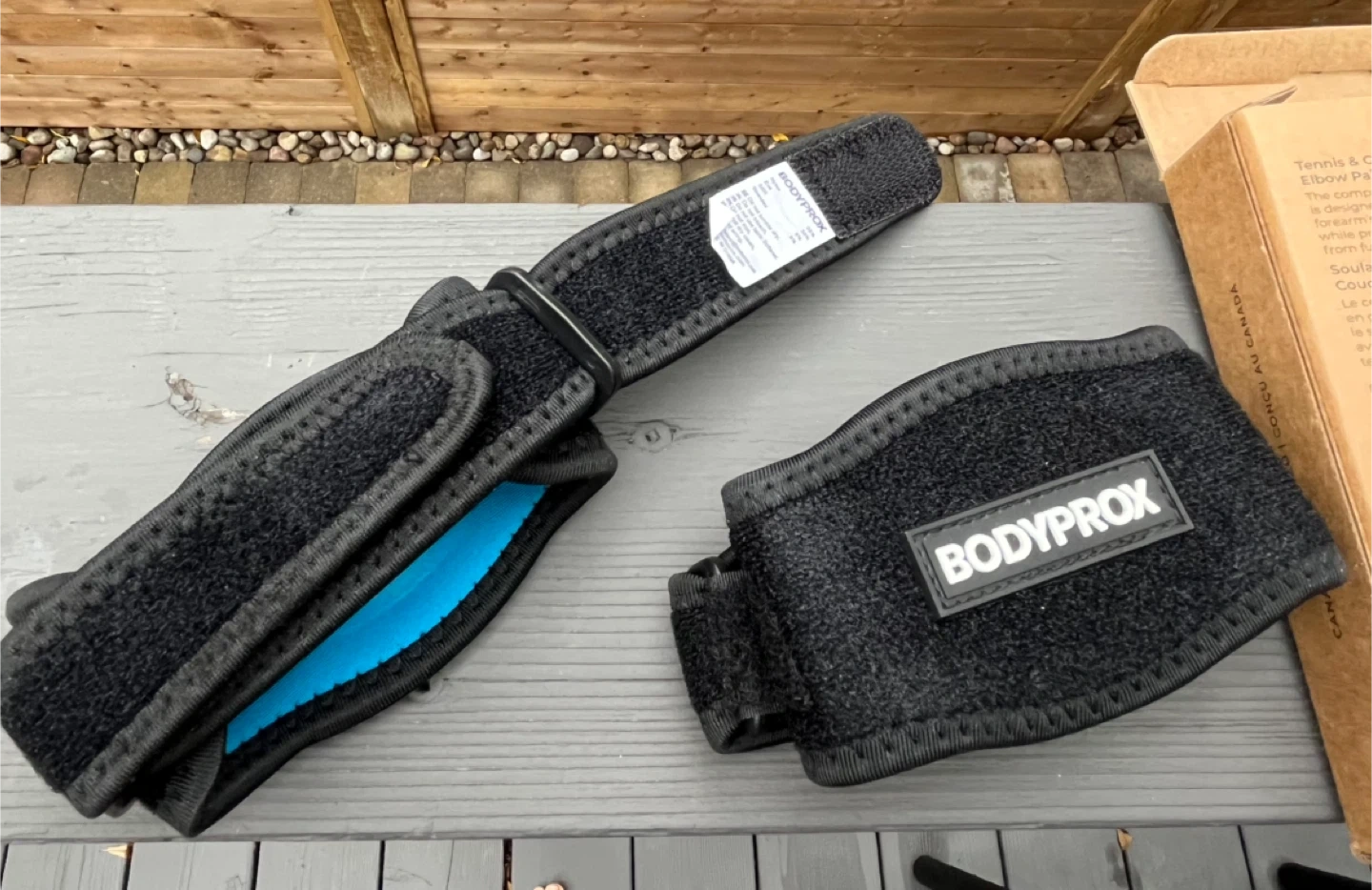 Selling a Bodyprox Elbow Brace 2 Pack designed for tennis and golfer's elbow pain relief - still in box. These braces provide support and comfort during activities. They are black and have the Bodyprox logo on them. Amazon choice product.