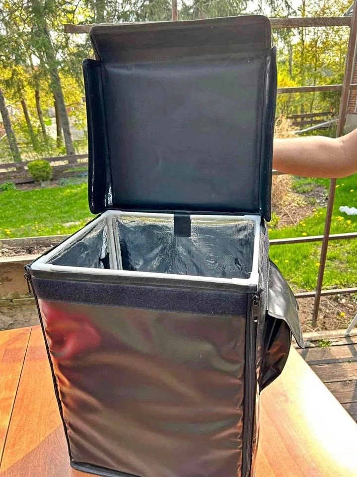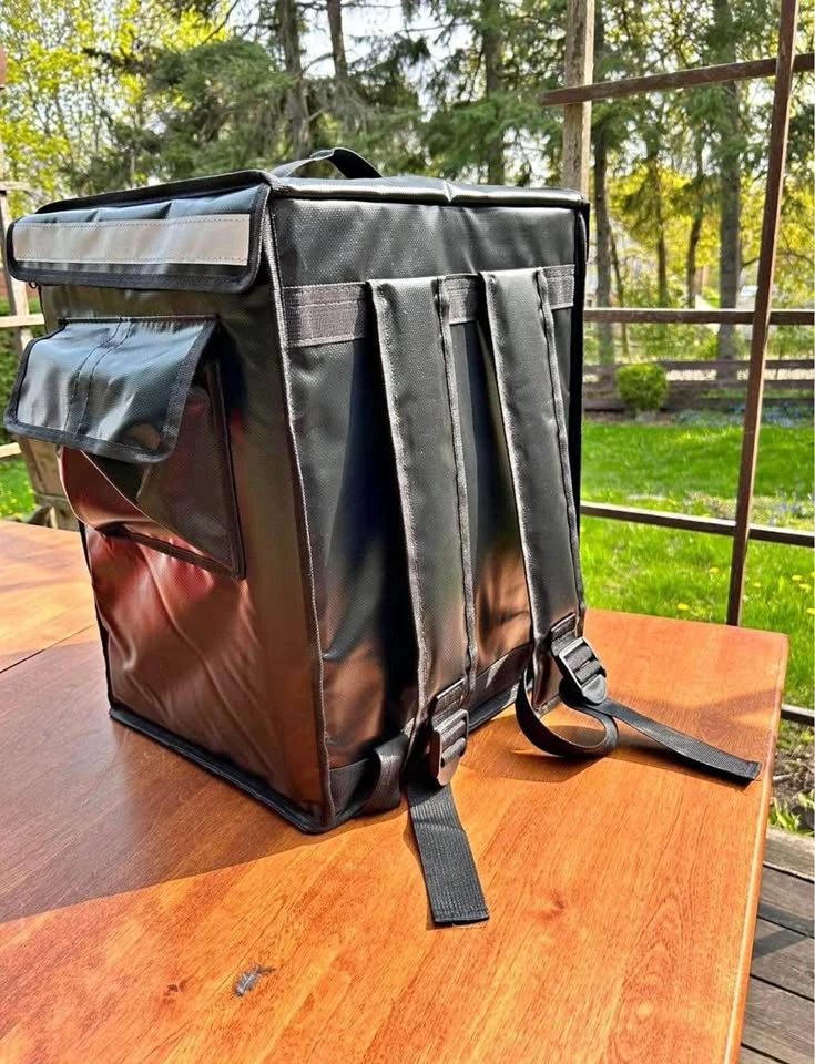 Insulated delivery bag with backpack straps. Ideal for food delivery. Has a small front pocket. Includes a zippered top closure. Has a reflective strip on the back. Includes a divider to separate items in the bag.