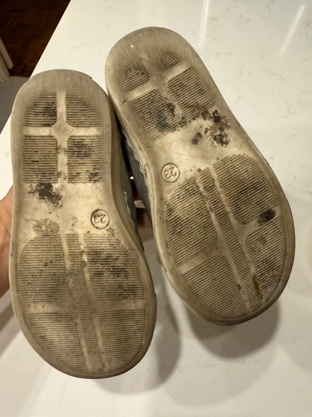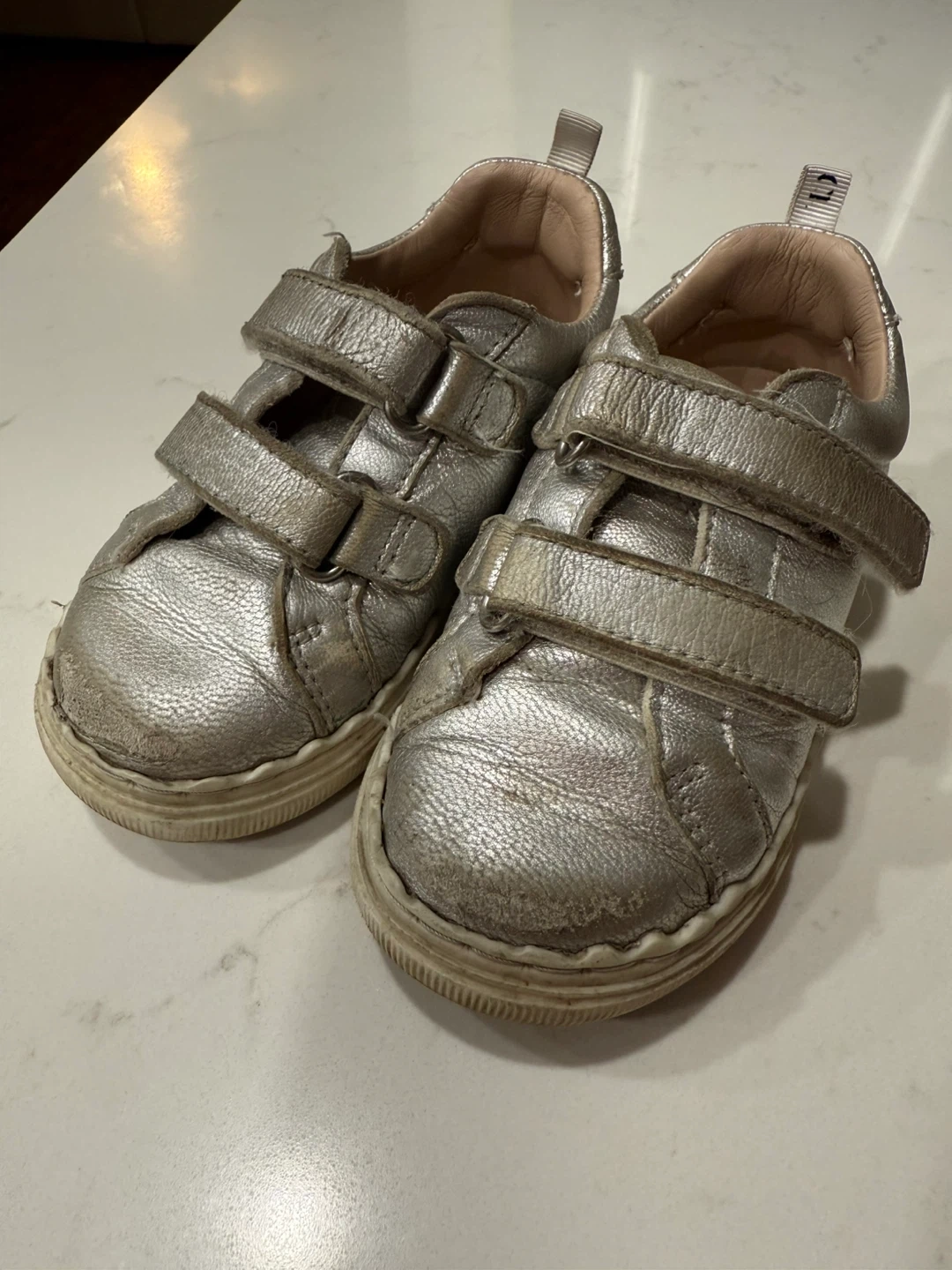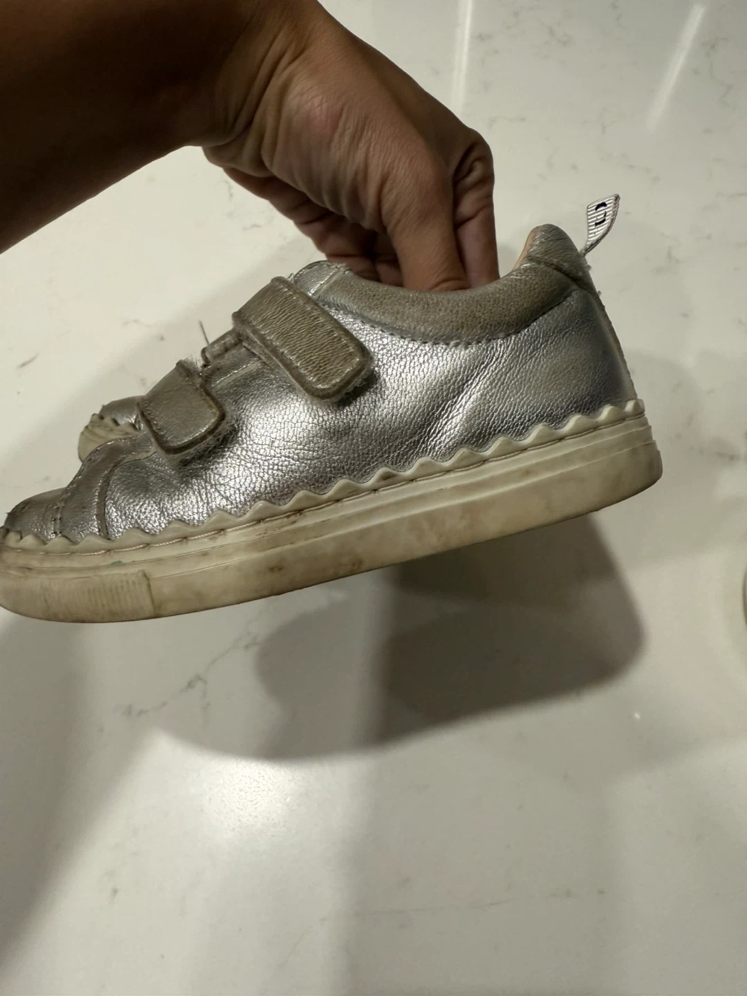 Chloe kids sneakers in shiny silver. Features convenient Velcro straps. In well loved condition but still very comfortable and cute and lots of life left!