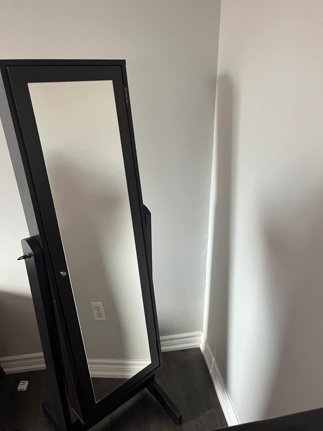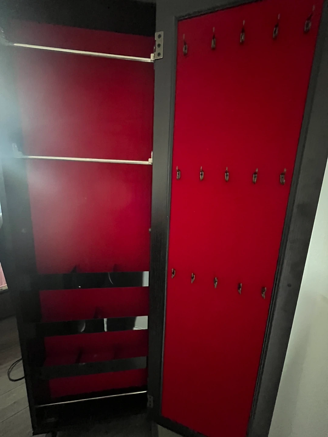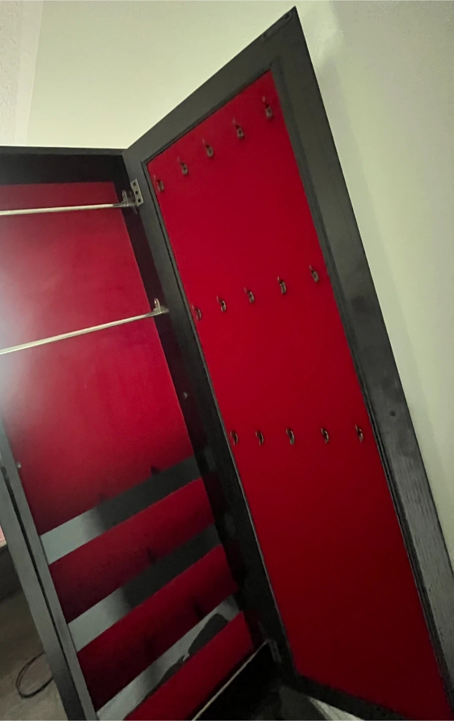 Selling a jewellery cabinet with a full-length mirror! It's in great condition and features a dark brown exterior with a red velvet interior. for organizing all your accessories and adding a touch of elegance to your space