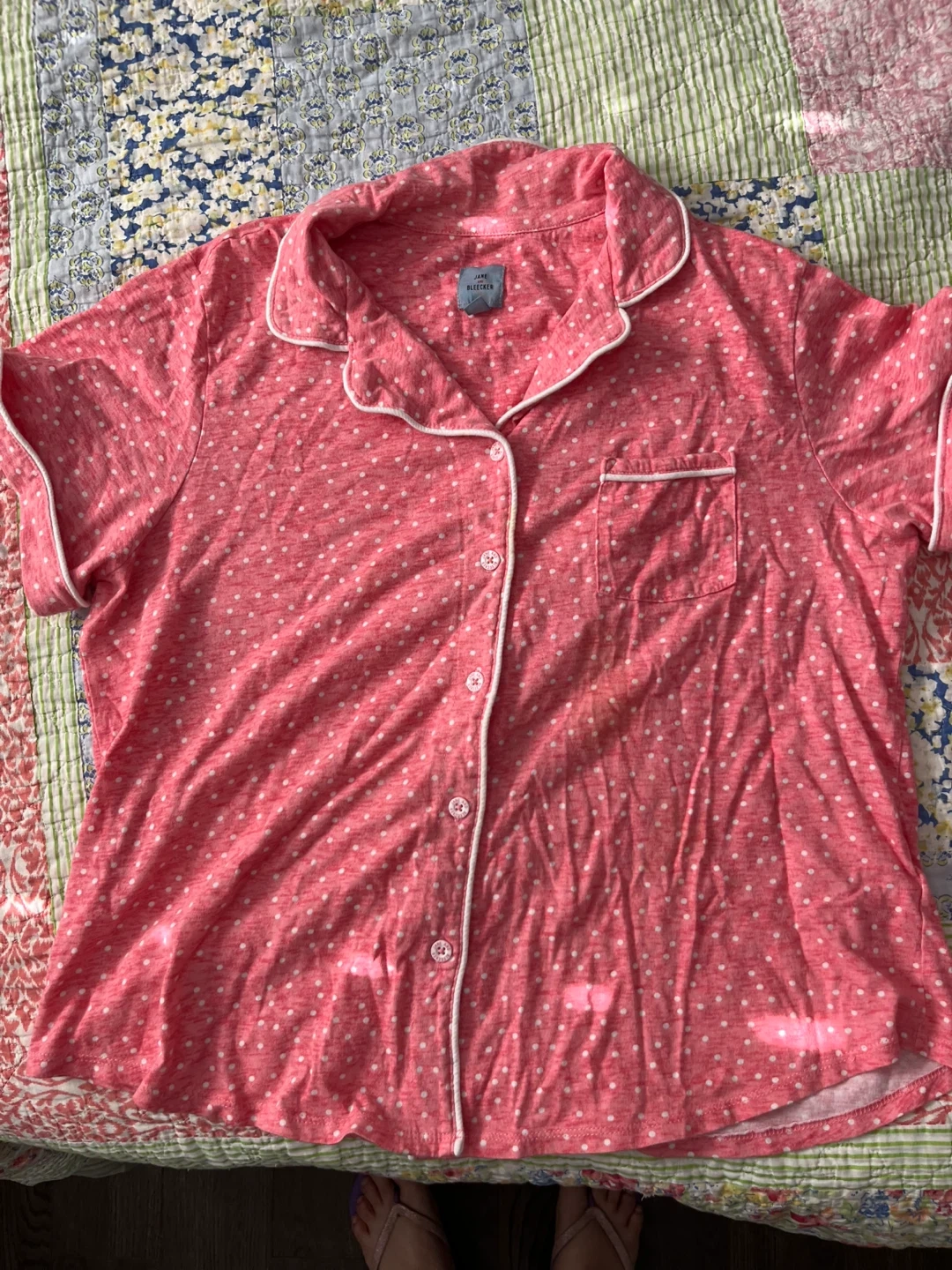 Selling a cute Jane and Bleecker pajama set! The set includes a button-down top and shorts, perfect for a comfy night's sleep