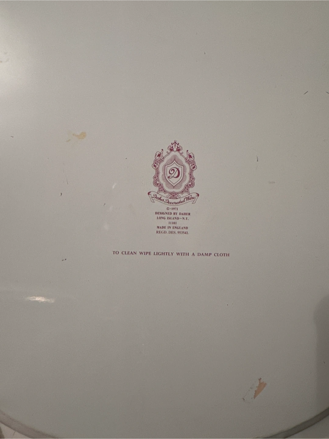 This is a beautiful large vintage metal tray made in England by Daher Decorated Ware. It measures 20.25" x 15.25" and is approximately 1" deep at the rim Because of the intricate design and beautiful colors of the tray, the imperfections only ad character. Minimal scratches, barely used Check all of my photos, as they are part of the description