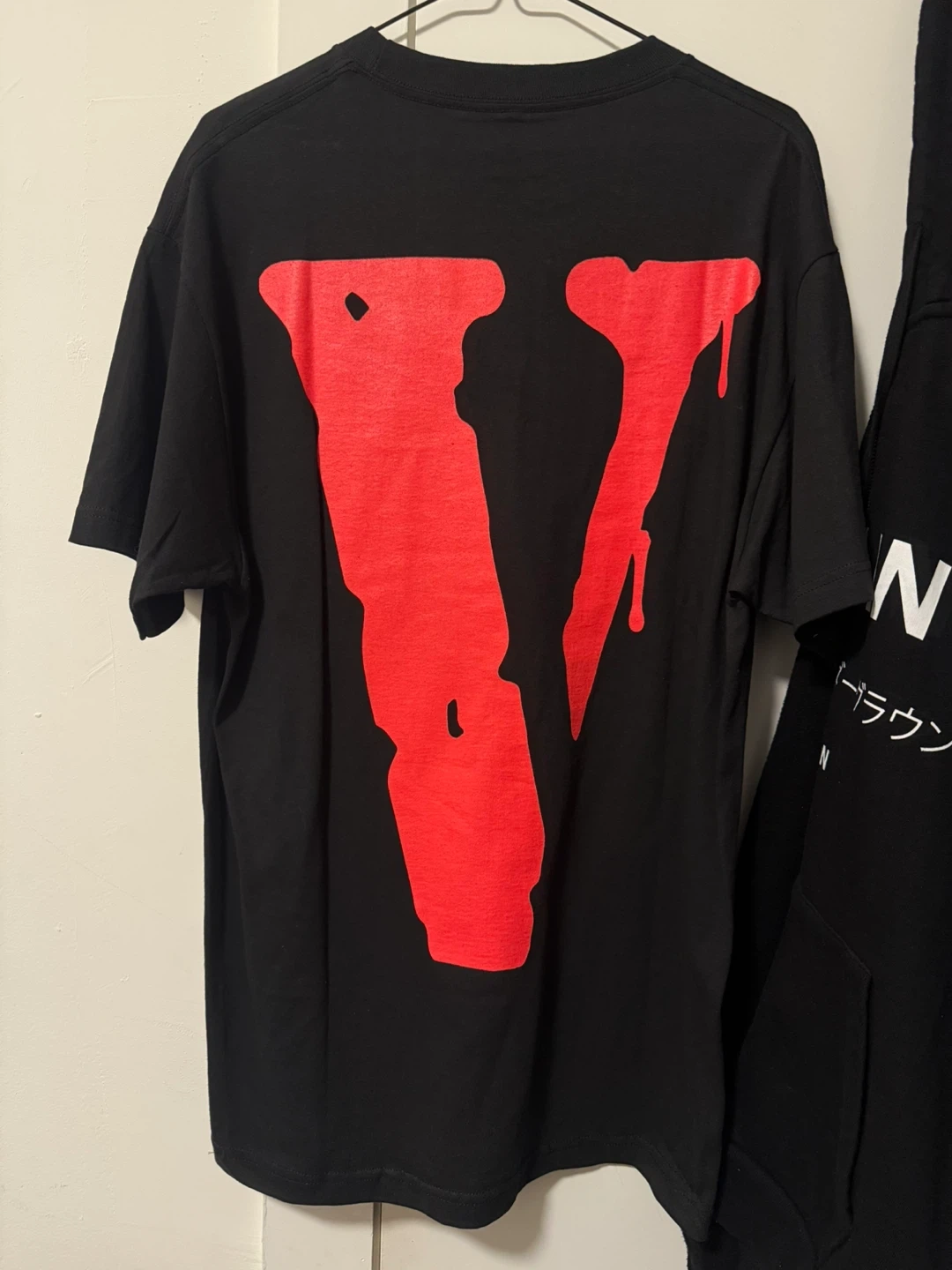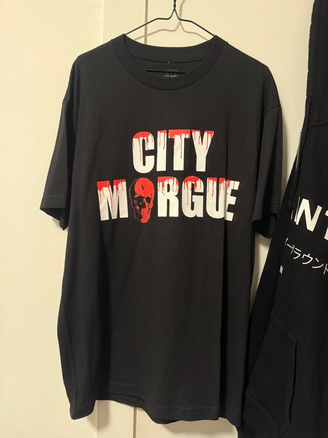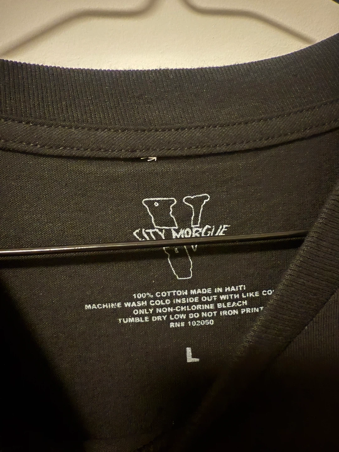 Selling a Vlone x City Morgue t-shirt in size Large. It's black with a large red "V" design on the back and "City Morgue" with a skull graphic on the front. The shirt is made of 100% cotton and made in Haiti. Machine wash cold inside out with like colours, only non-chlorine bleach, tumble dry low, do not iron print!