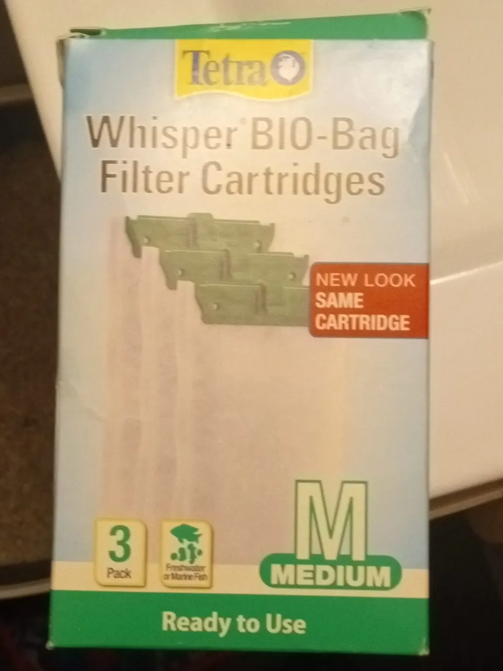 Selling a 3-pack of Tetra Whisper BIO-Bag Filter Cartridges for freshwater or marine fish. These are size medium and ready to use. Has a new look, but it's the same cartridge you know and love!