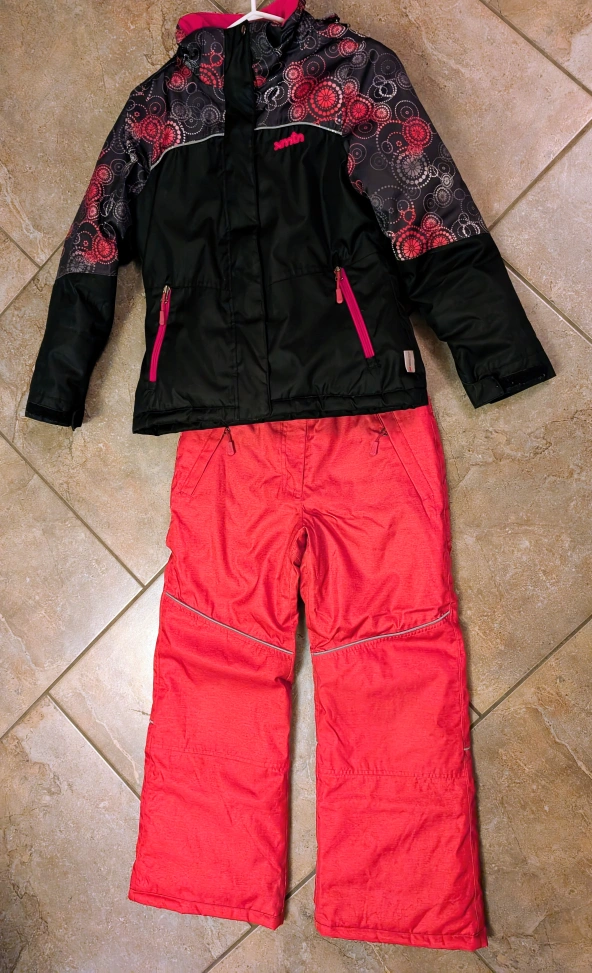 Girl's ski snowsuit size 10. It includes both the jacket and the pants. The jacket is black with a colourful pattern on the upper part, reflective details and it has a detachable hood. The pants are a bright coral (pink) colour with detachable bib, adjustable suspenders, reflective detail and zippered pockets. Perfect for keeping warm and dry on the slopes or in the snowny weather! Barely worn and in like -new condition. Brand name: XMTN