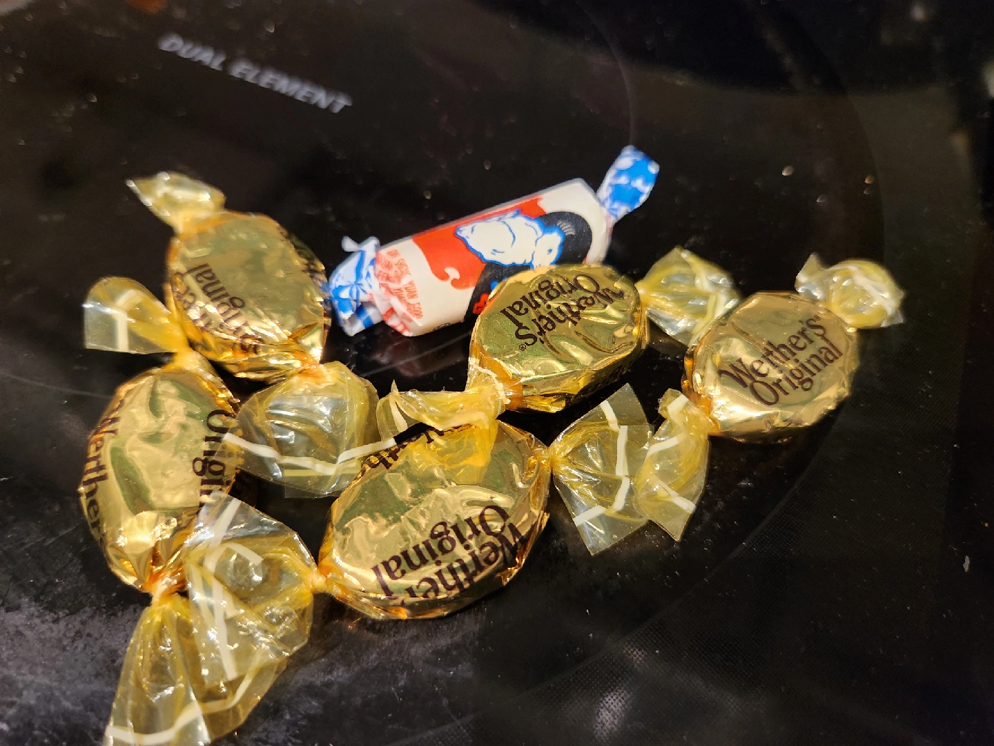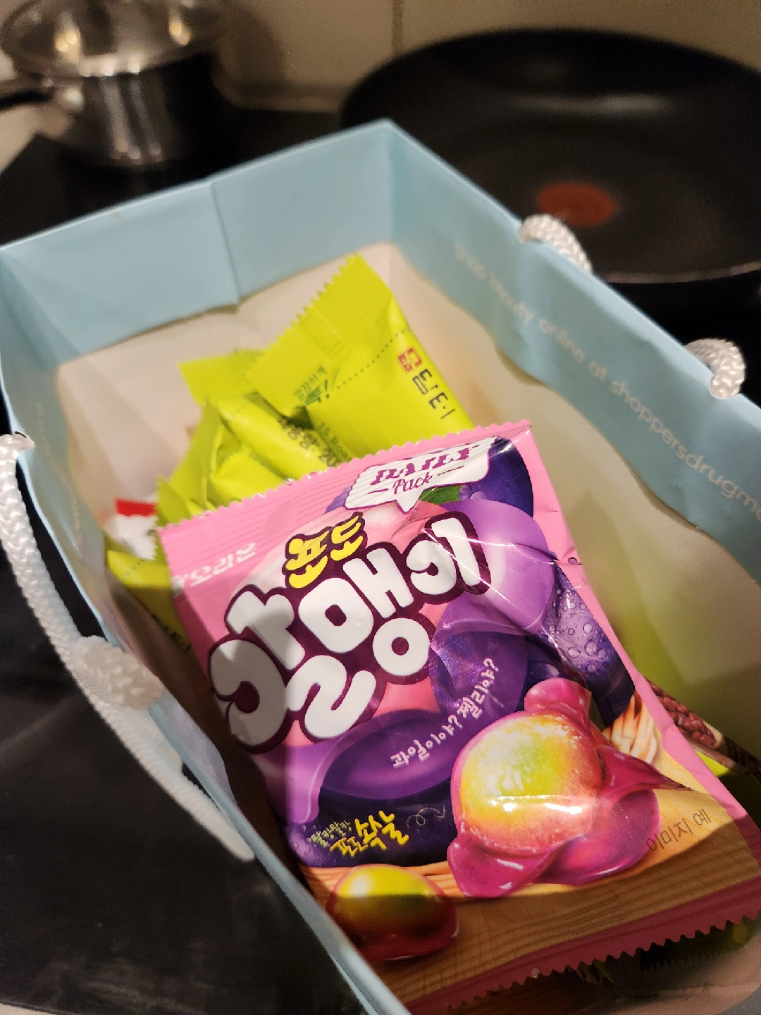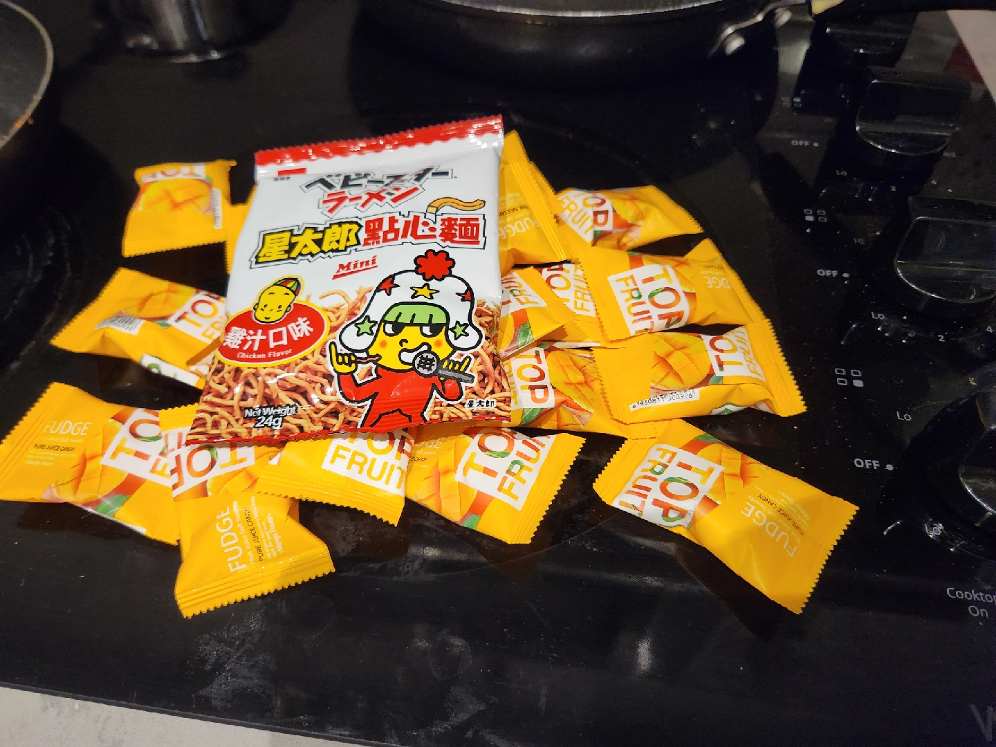 A mix of individually wrapped candies and snacks, perfect for a little treat! Includes Werther's Original, Bebistar Ramen Mini, 15 Roasted Grain with Yam, mango jelly, and and grape gummy!