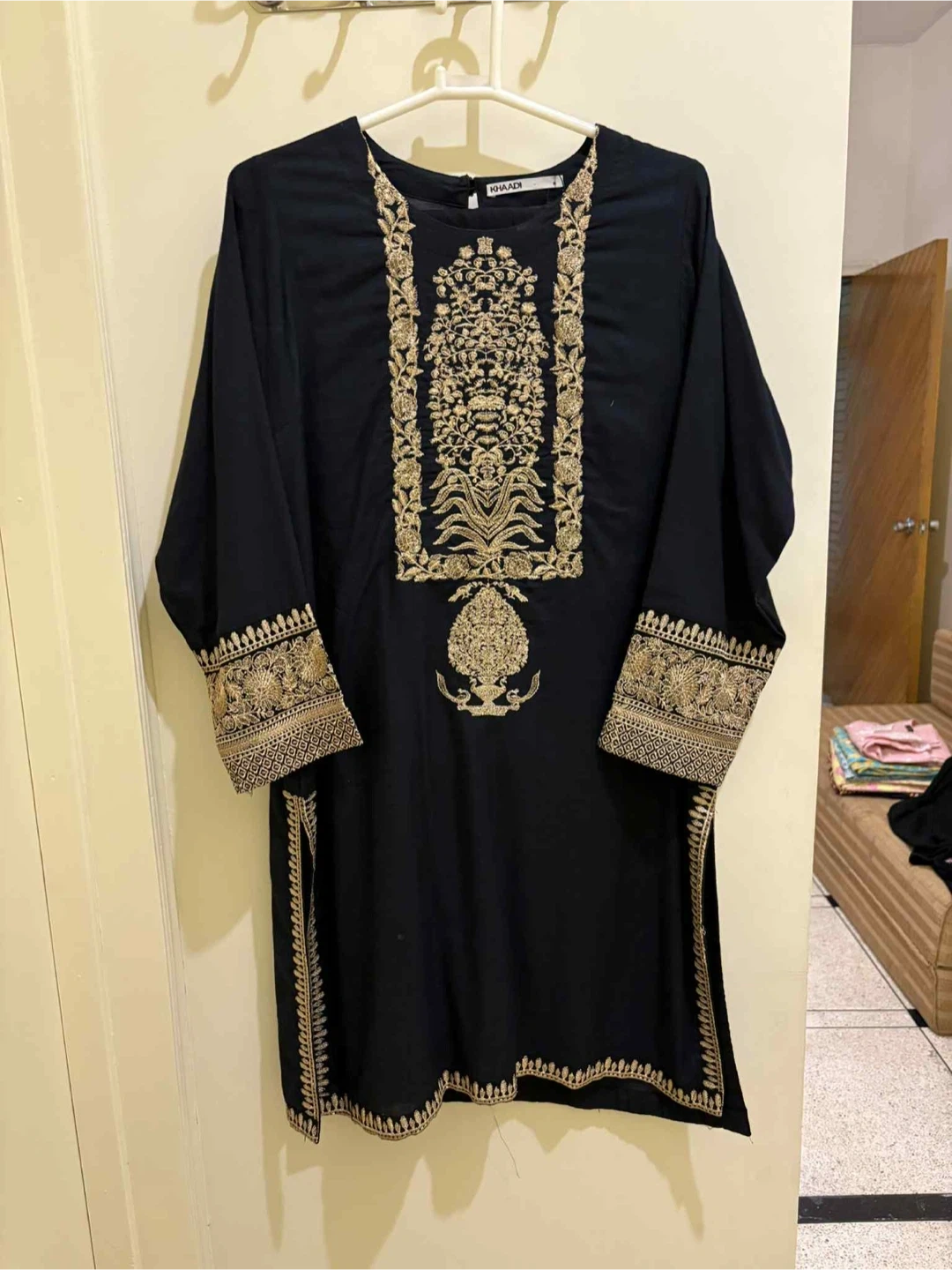 Selling a beautiful Khaadi kurti in black with gold embroidery. It's in great condition and perfect for a special occasion or everyday wear. The intricate embroidery adds a touch of elegance!