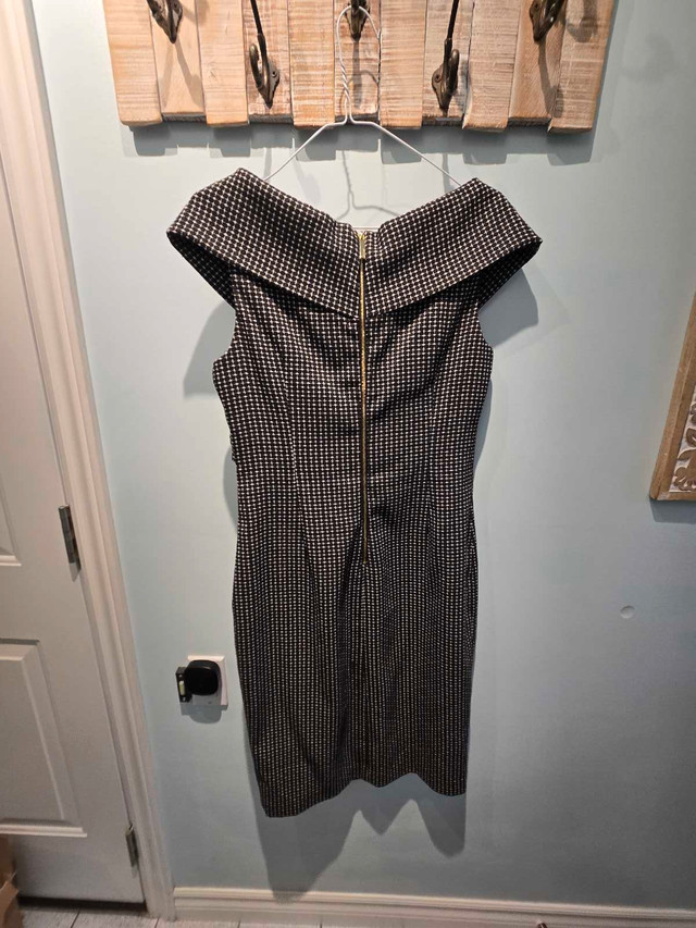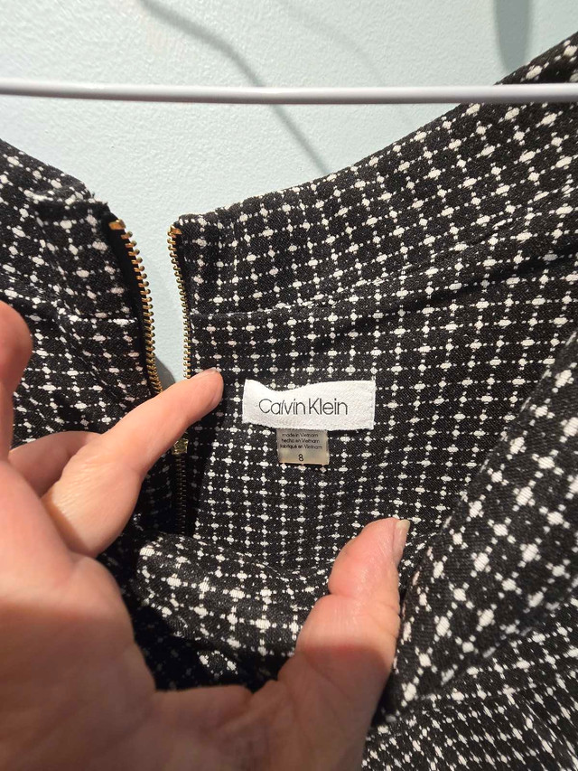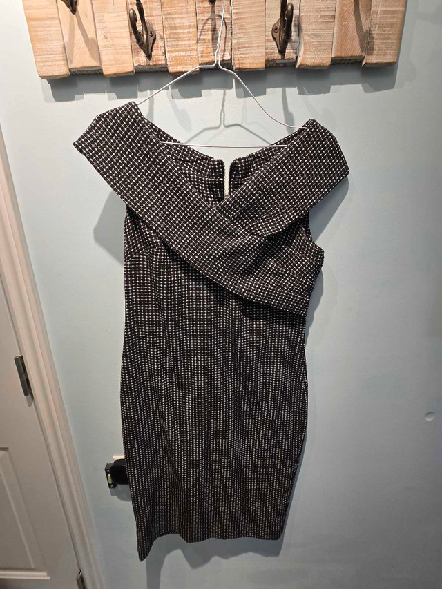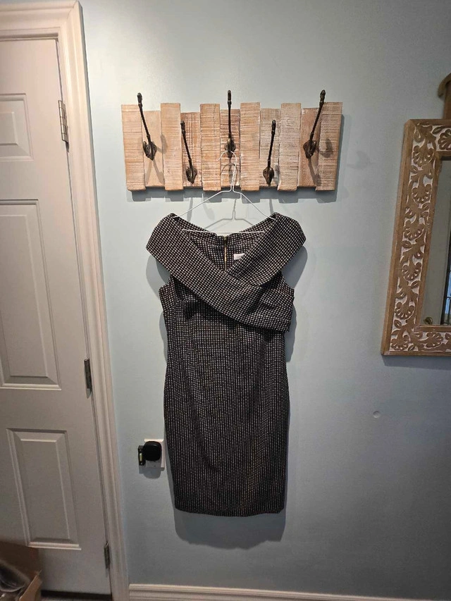 This Calvin Klein dress is an elegant choice for any special occasion, featuring a sophisticated black and white patterned fabric and a flattering silhouette in size 8. It has been gently worn and is in very good condition, ready to make you feel fabulous! Hides all the imperfections of your figure Here are some additional details: * Brand: Calvin Klein * Size: 8 * Colour: Black and White * Style: Elegant, Off-the-shoulder If you're seeing this ad, the dress is still available—no need to ask! I'm excited to find it a new home!