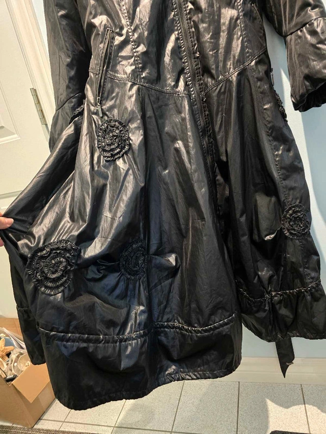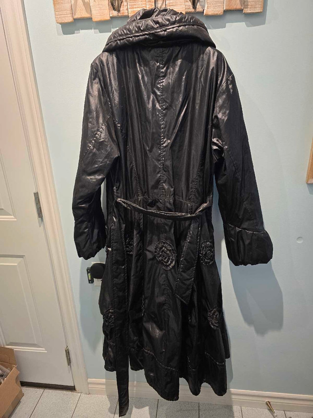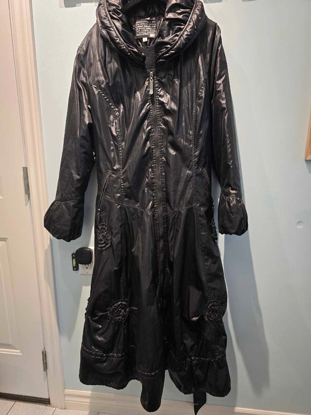 This is a lovely black Entrata brand winter coat in size medium with a unique design and accents. Very feminine. It's in very good condition and perfect for staying warm and stylish during the colder months. This coat will keep you cozy on many winter escapades. If the ad's still up, the coat's still available!