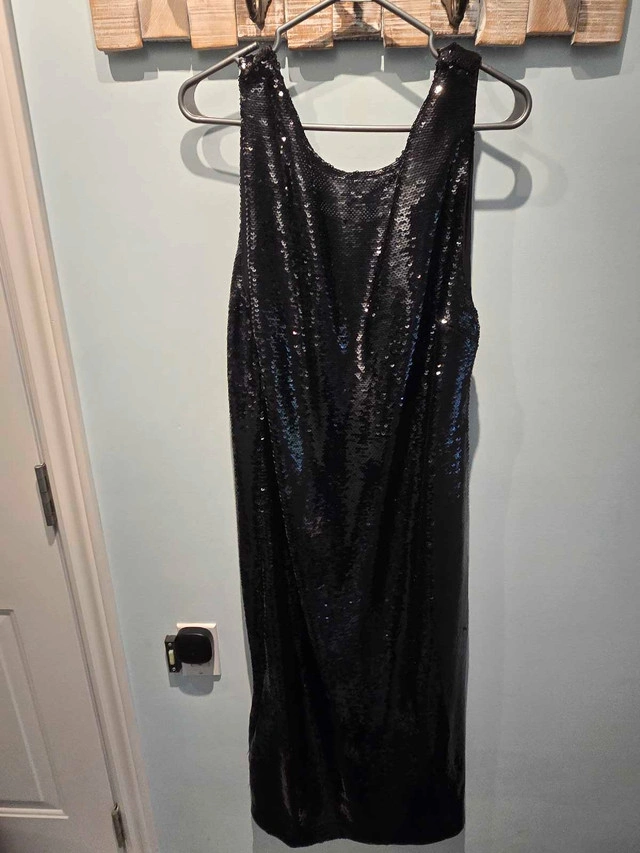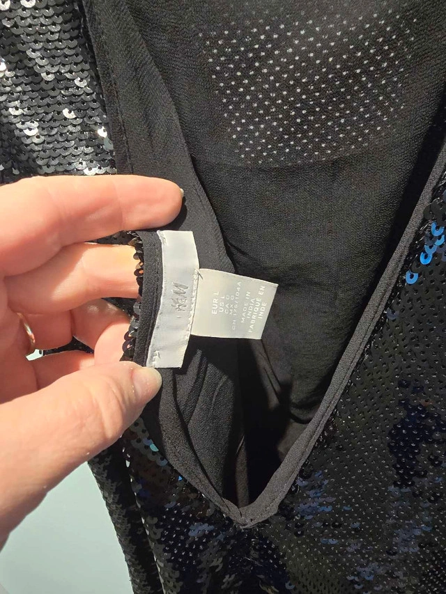 Add some sparkle to your wardrobe with this H&M black sequin dress, size large, perfect for a night out or special occasion. The dress is in very good condition, ready to turn heads!