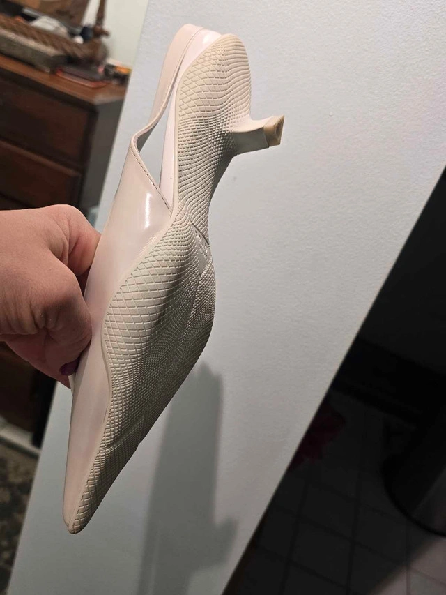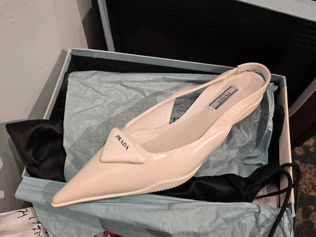 Step out in style with these chic Prada shoes! These elegant heels feature a sleek design and are perfect for adding a touch of luxury to any outfit. Worn only 2-3 times. Although these shoes are in used condition, they have been well-maintained and still have plenty of life left. Elevate your wardrobe with this stylish pair! Additional details: * Brand: Prada * Colour: Off-white * Size: EU 37 (approximately US 7) * Material: Leather * Heel Height: Kitten heel If the ad is up, they're still available!