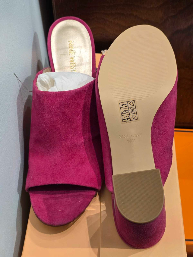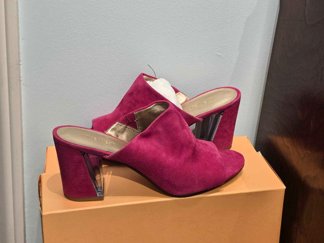 Nine West fuchsia suede heeled mules, size 10M, featuring a chic, open-toe design and a modern, clear block heel for a trendy touch. They are in new in perfect condition.