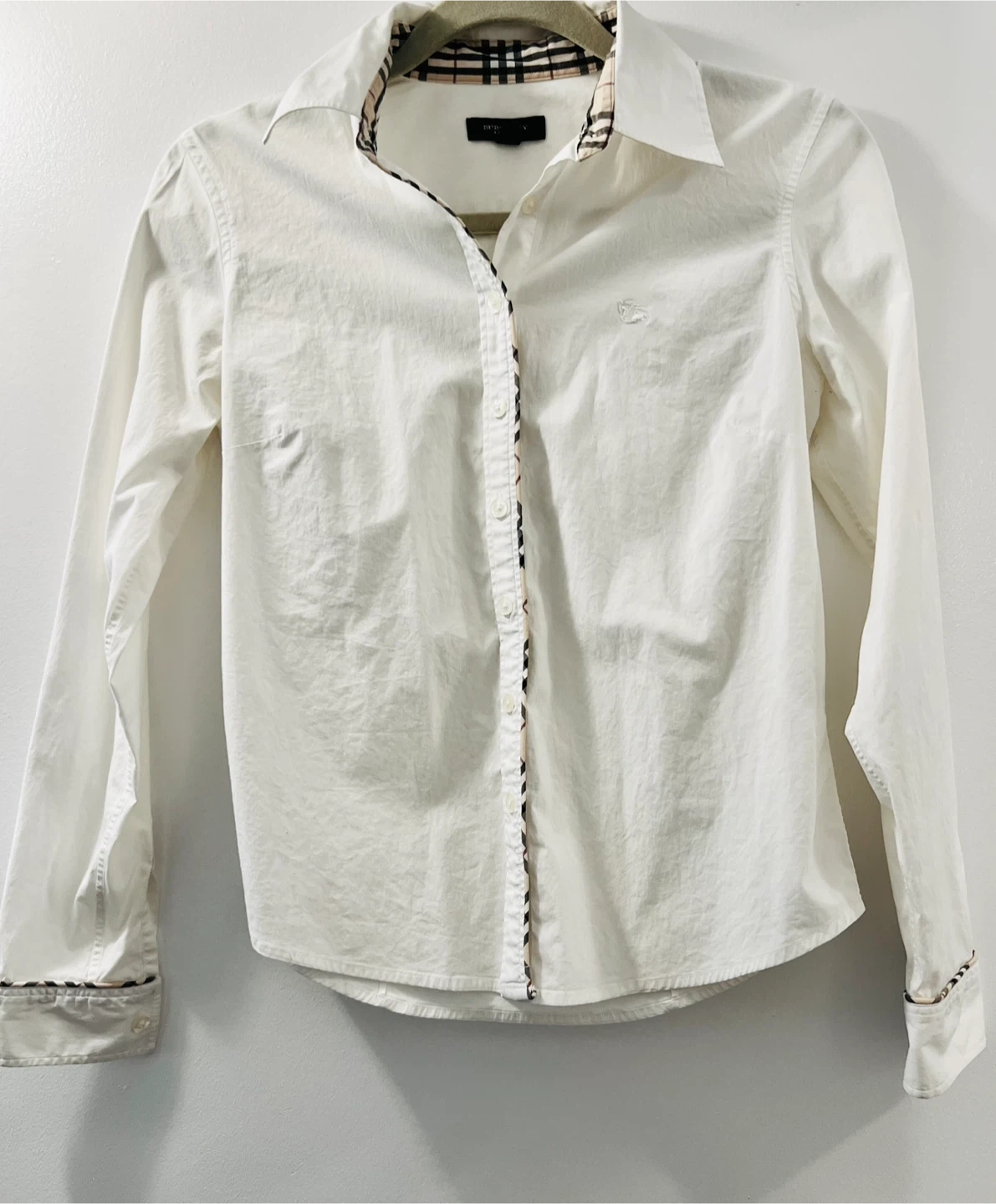 Selling a classic Burberry button-up shirt in white! It's a size small and made from 95% cotton with a touch of elastane for a comfortable fit.