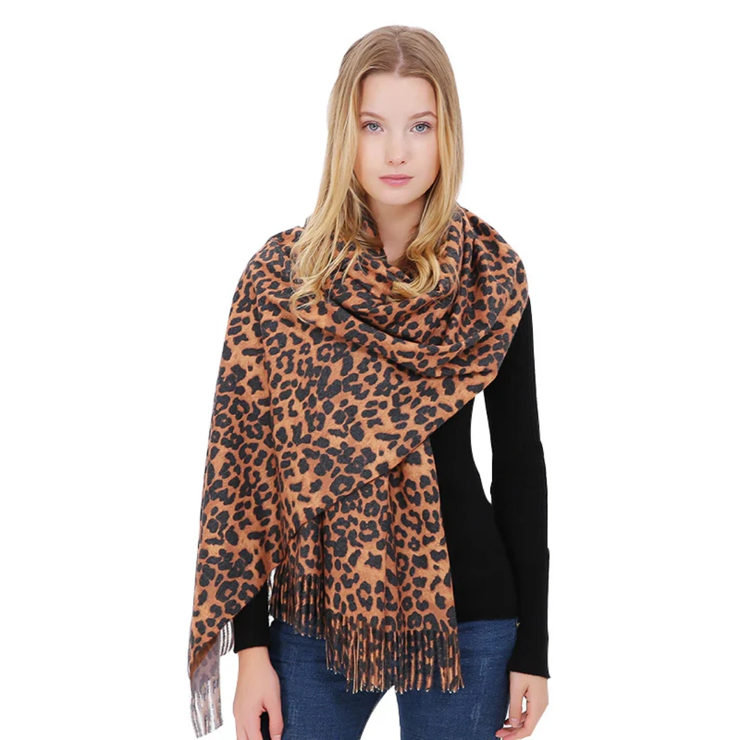 - Cozy up with this stylish, double-sided scarf/shawl! - One side features a brown and black leopard pattern, and the other side features a plain but classic brown. - Features a fringed edge. - This scarf is perfect for adding a touch of style and warmth to any outfit. - Care: Hand wash in cold water. No wringing. Dry flat.