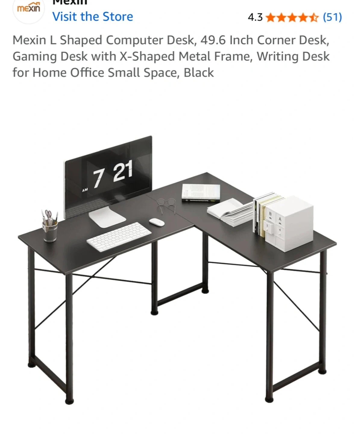 21Selling a Mexin L-shaped computer desk in black! It's a 49.6-inch corner desk, perfect as a gaming desk or writing desk for a home office. Features an X-shaped metal frame and is designed for small spaces