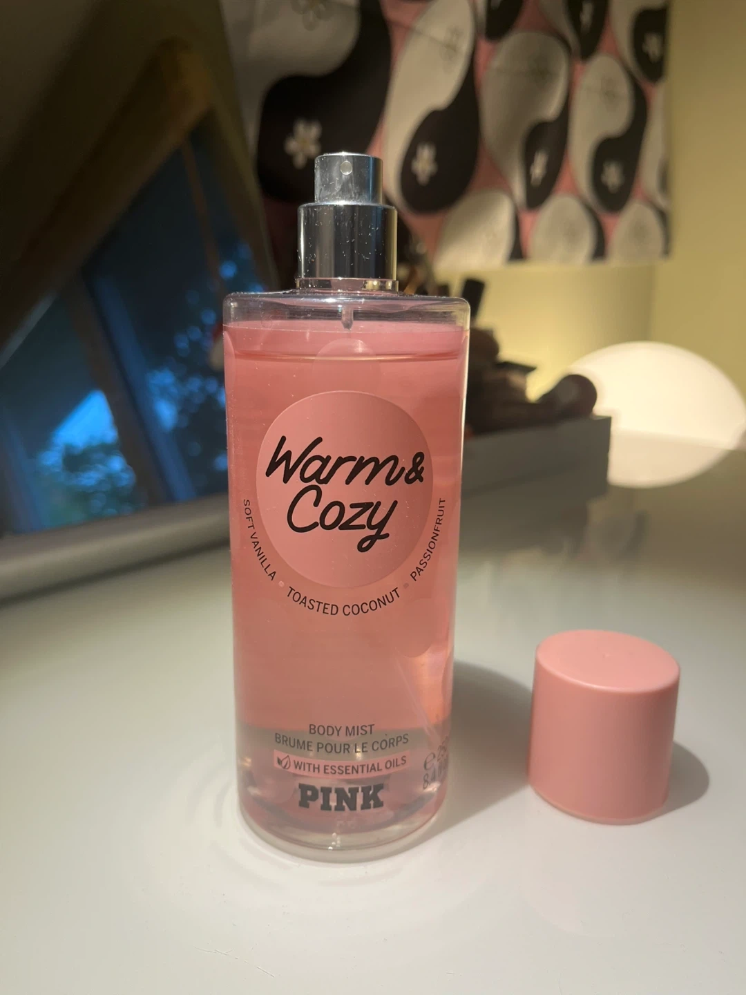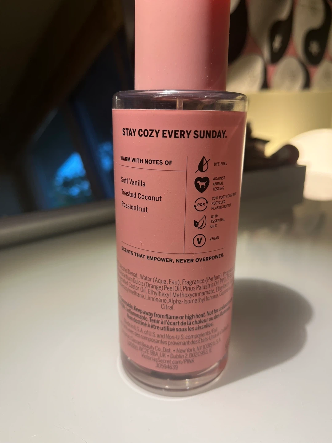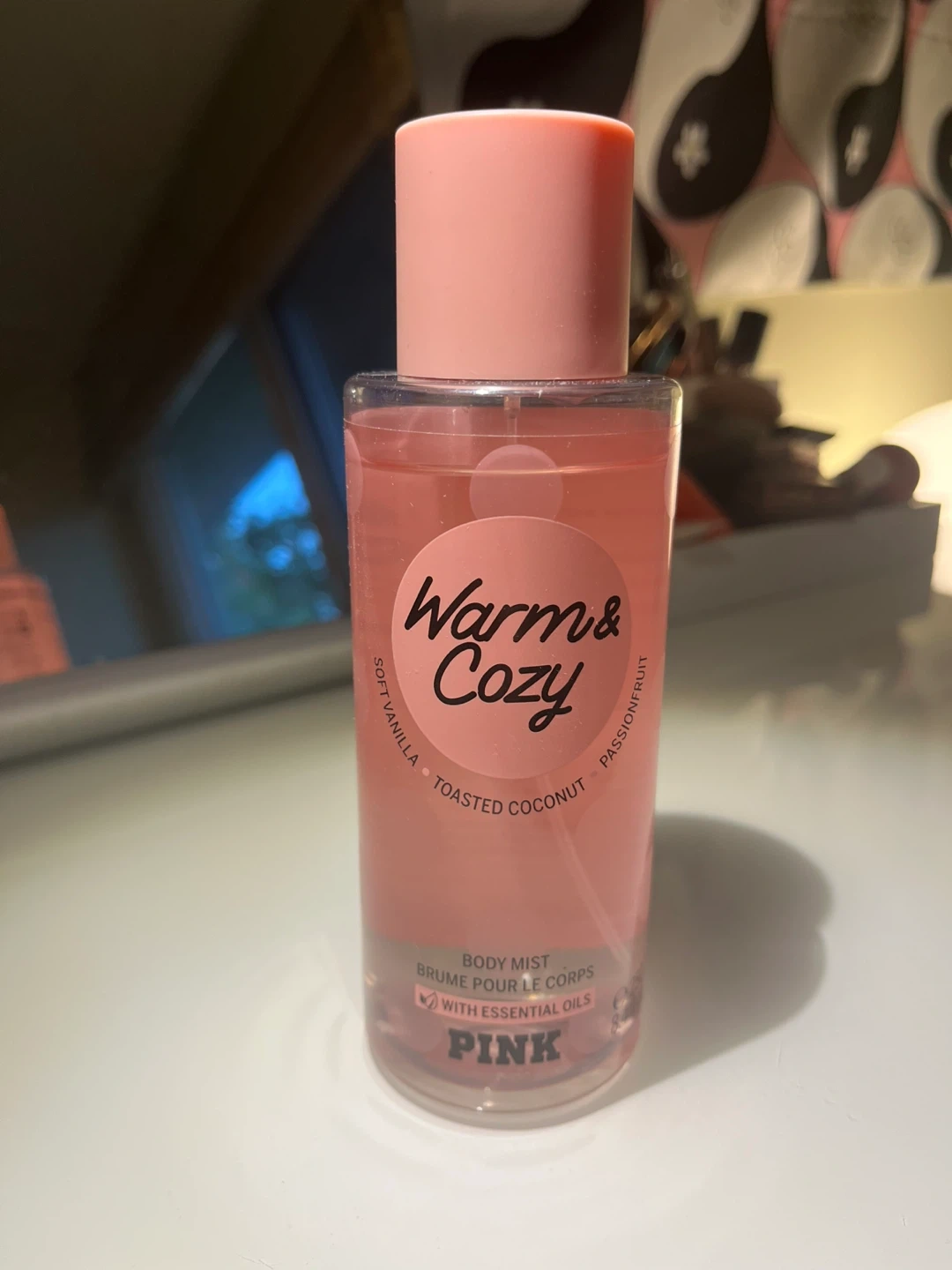 Selling a PINK Warm & Cozy body mist! This body mist has warm notes of soft vanilla, toasted coconut, and passionfruit. It's dye-free and vegan, and the bottle is made with 25% post-consumer recycled plastic. It's a great scent to stay cozy every Sunday